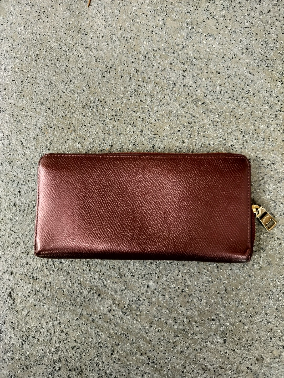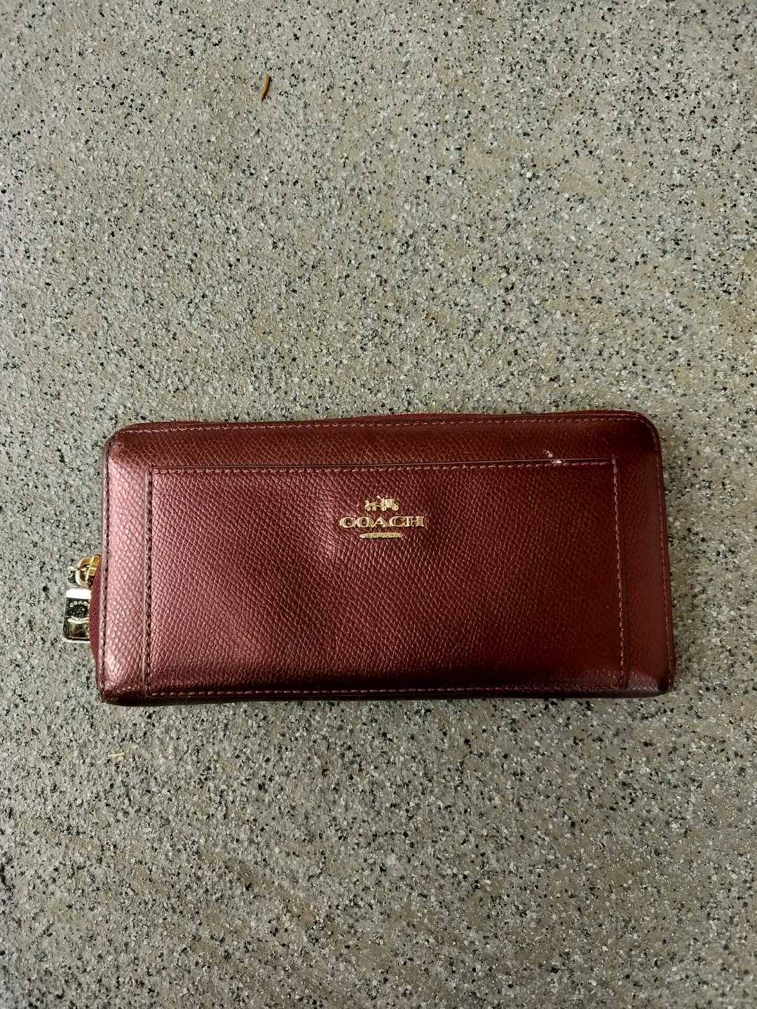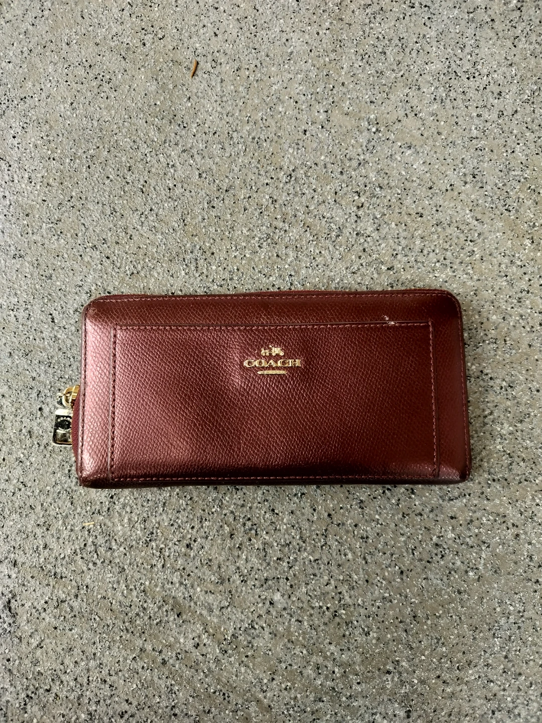 This is a Coach zip-around wallet in a metallic rose gold colour. It's made of leather and has a zippered closure. This wallet is great for keeping your cards and cash organized.