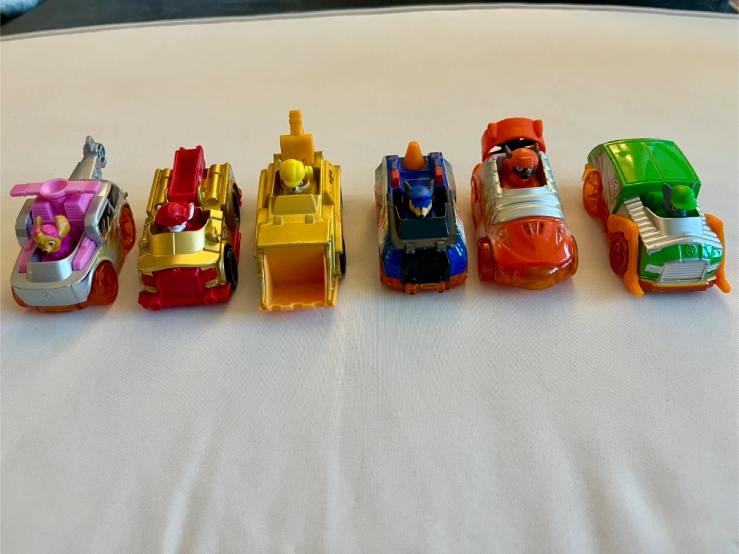 A set of six Paw Patrol toy vehicles. Includes various pup characters and their vehicles. These are fun for imaginative play and your Paw Patrol fan! See link below for more pictures and a detailed description.