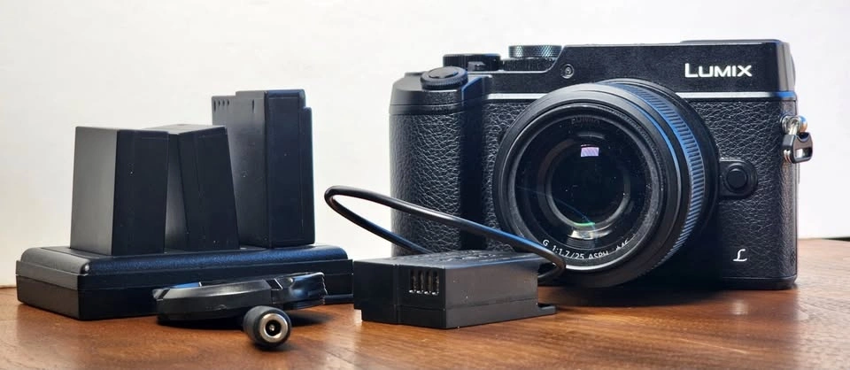 Includes three batteries, a charger, a 25mm f/1.7 lens, a lens cap, and the camera body. Shutter count is under 7k. Capture life's stunning moments with the Panasonic LUMIX DMC-GX8, a mirrorless interchangeable lens camera that combines advanced technology with user-friendly functionality. From the renowned Panasonic brand, this camera is designed to deliver high-quality performance, boasting a sharp Lumix 25mm f/1.7 aperture lens that allows for beautiful depth of field and low-light conditions. This camera is an excellent choice for both photography enthusiasts and seasoned professionals seeking a compact yet powerful tool for capturing their creative vision. With its included accessories, it's ready to accompany you on your next photographic adventure.