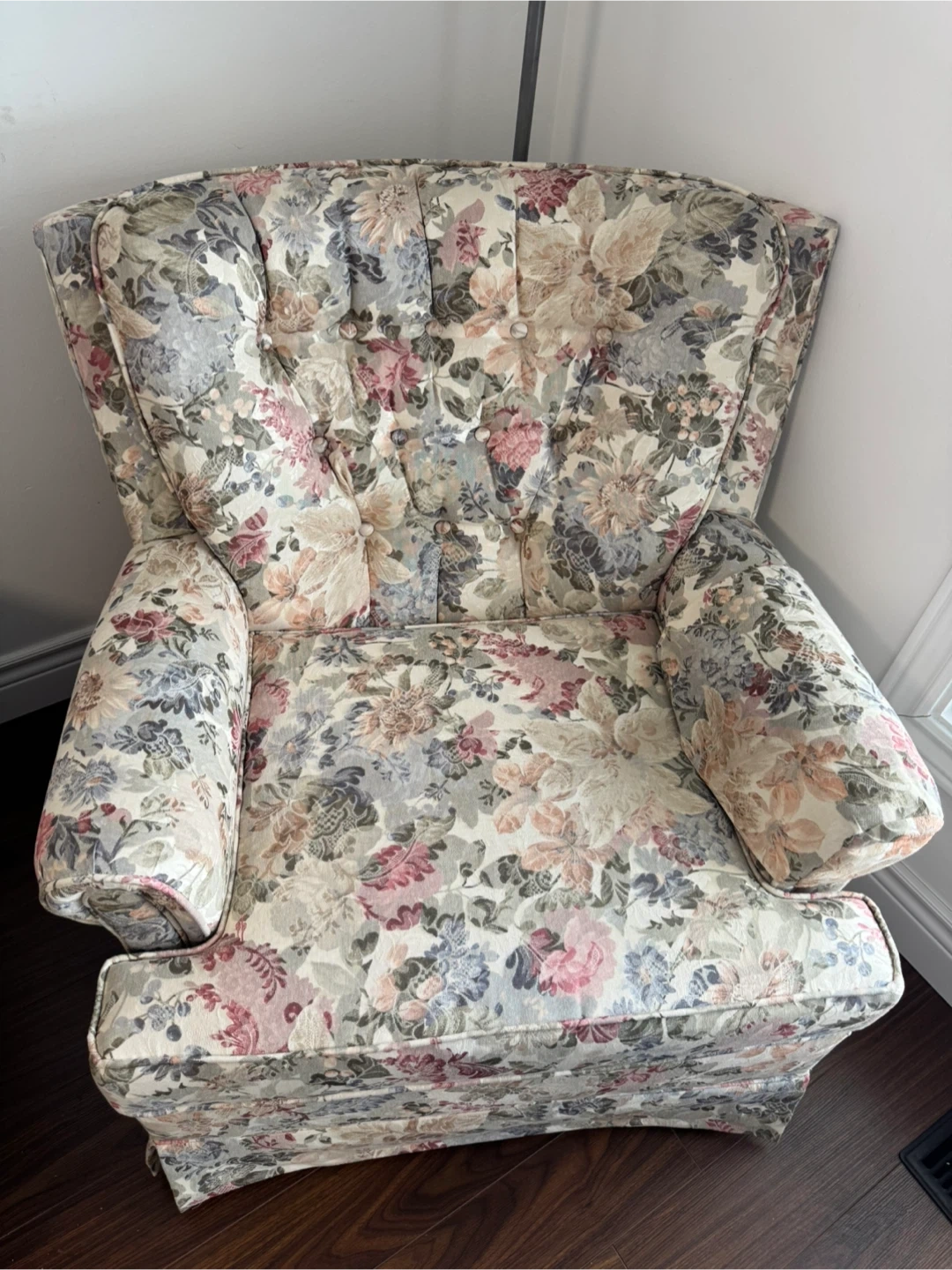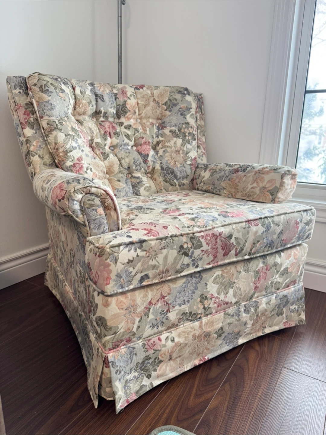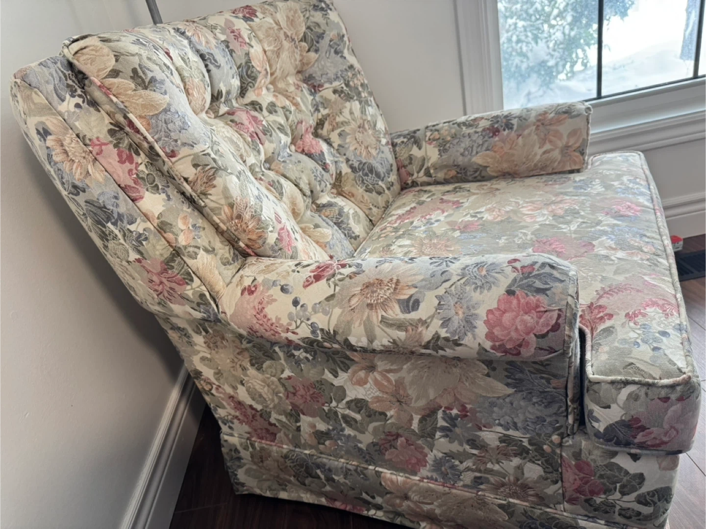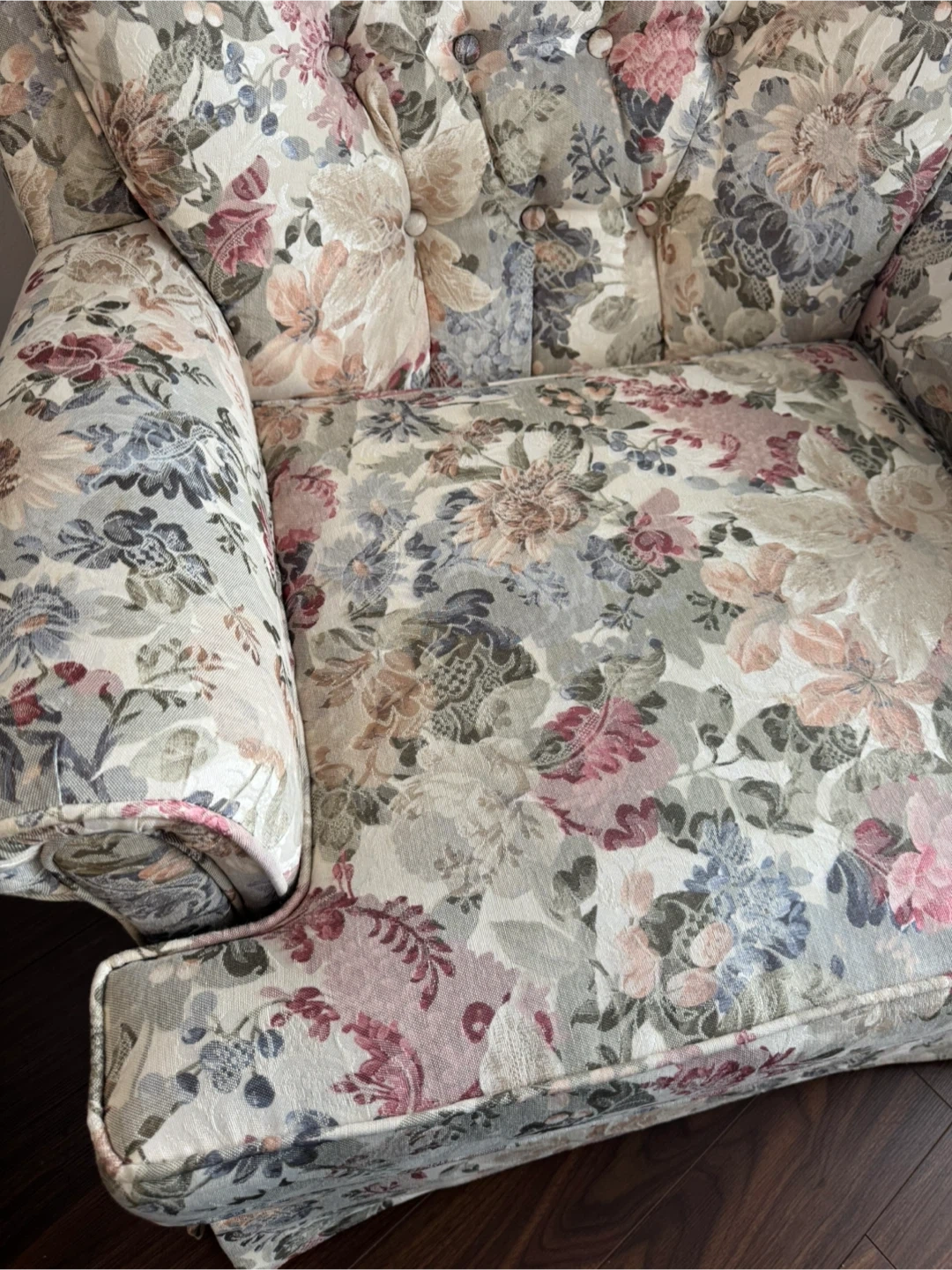 This armchair features a classic floral print with tufted detailing on the back. It has comfortable rolled arms and a skirted base. Upholstery appears to be a durable fabric.