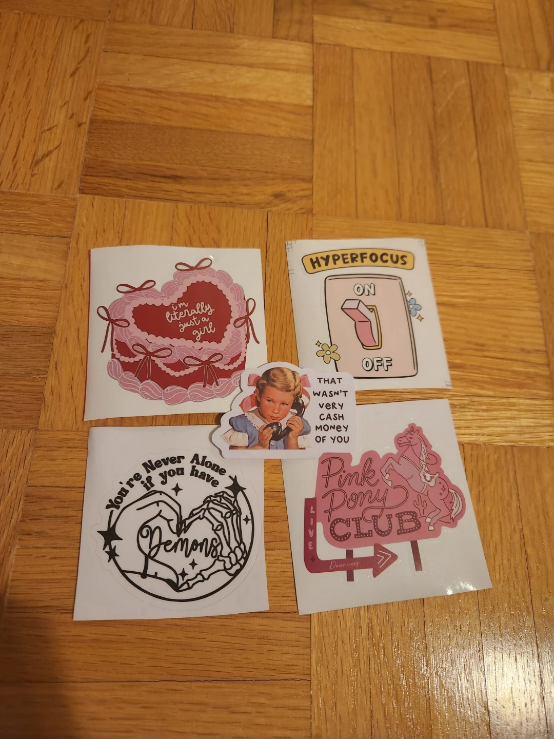This is a sticker pack featuring a heart-shaped cake that says 'I'm literally just a girl.' It also includes a 'Hyperfocus ON/OFF' switch sticker, a vintage-style girl on the phone with text, a 'You're Never Alone if you have Demons' sticker, and a 'Pink Pony Club' sticker. These stickers are perfect for decorating laptops, water bottles, or notebooks!
