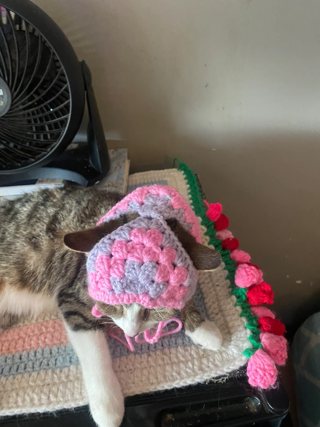 Handmade crocheted hat and matching flower trim for your furry friend. Made with soft yarn in pink and lavender. It's adorable!