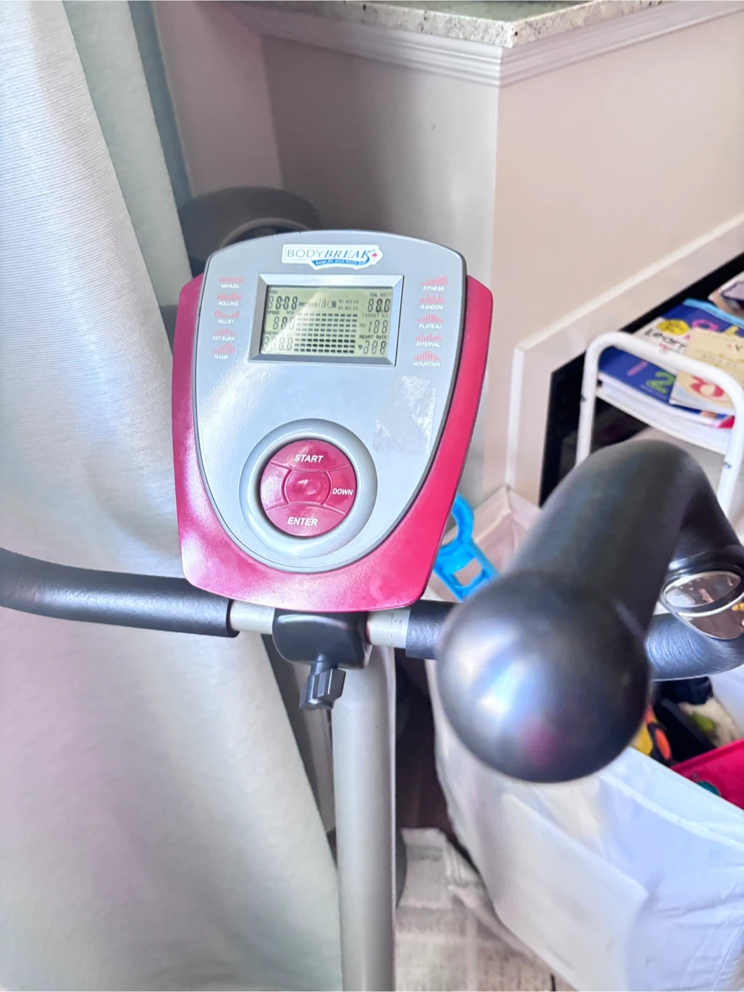 This is a BodyBreak 707 exercise bike. It has multiple programs and displays time, speed, distance, and heart rate. Get a great workout at home!