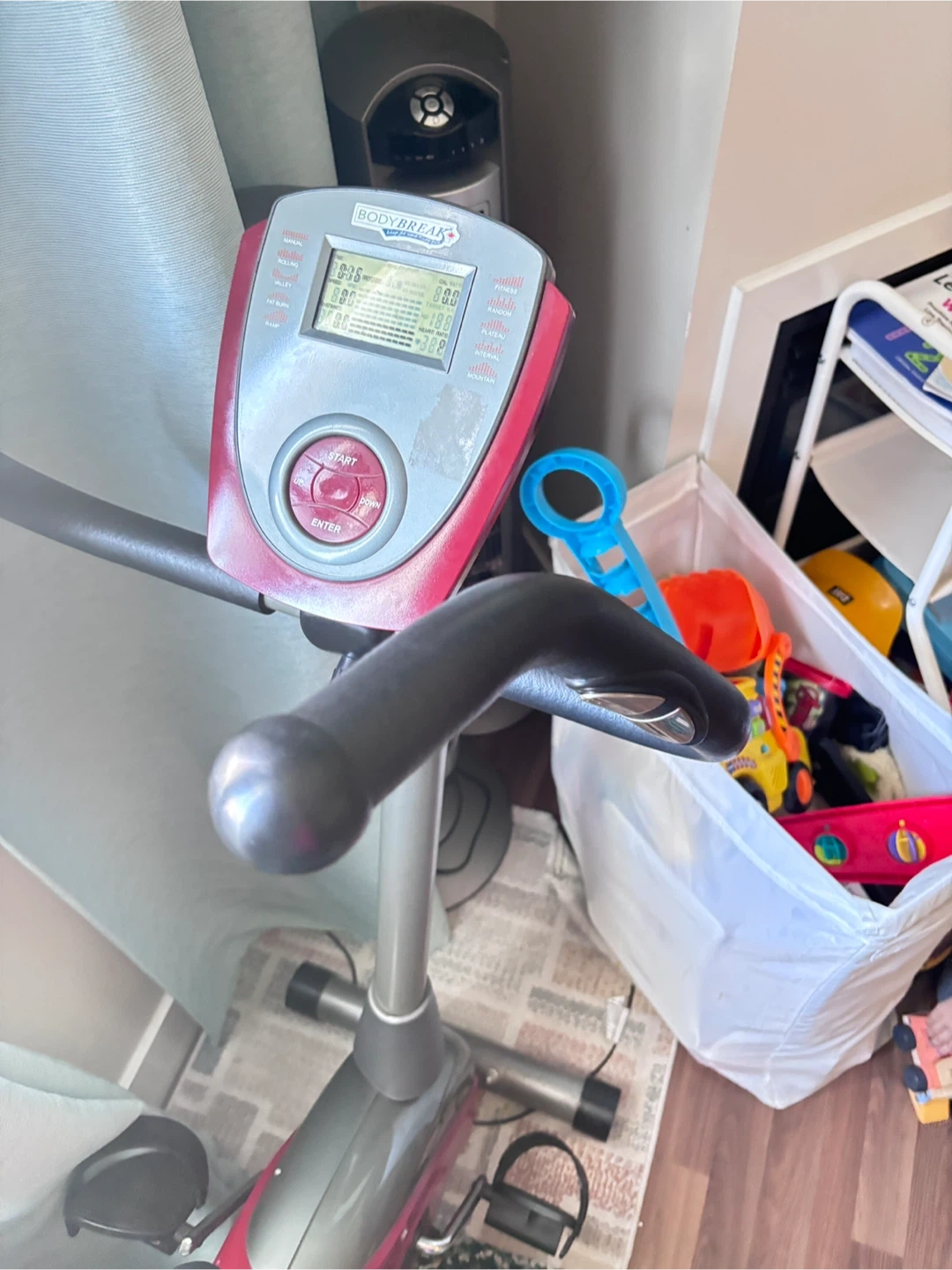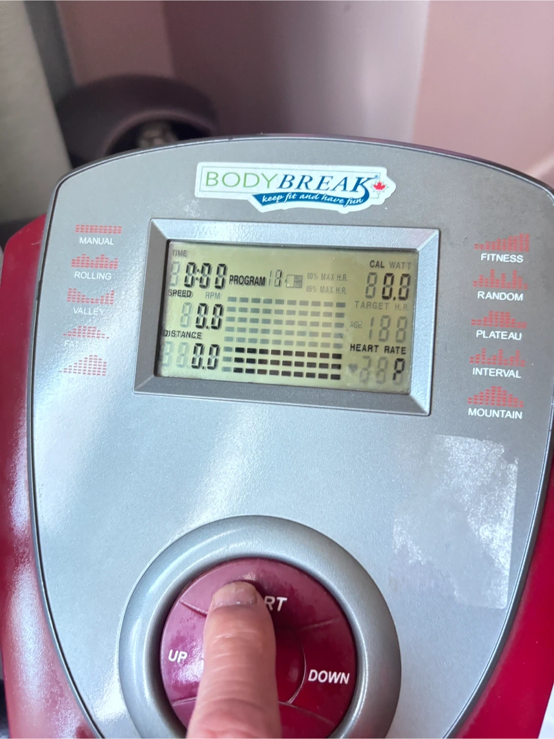 This is a BodyBreak 707 exercise bike. It has multiple programs and displays time, speed, distance, and heart rate. Get a great workout at home!