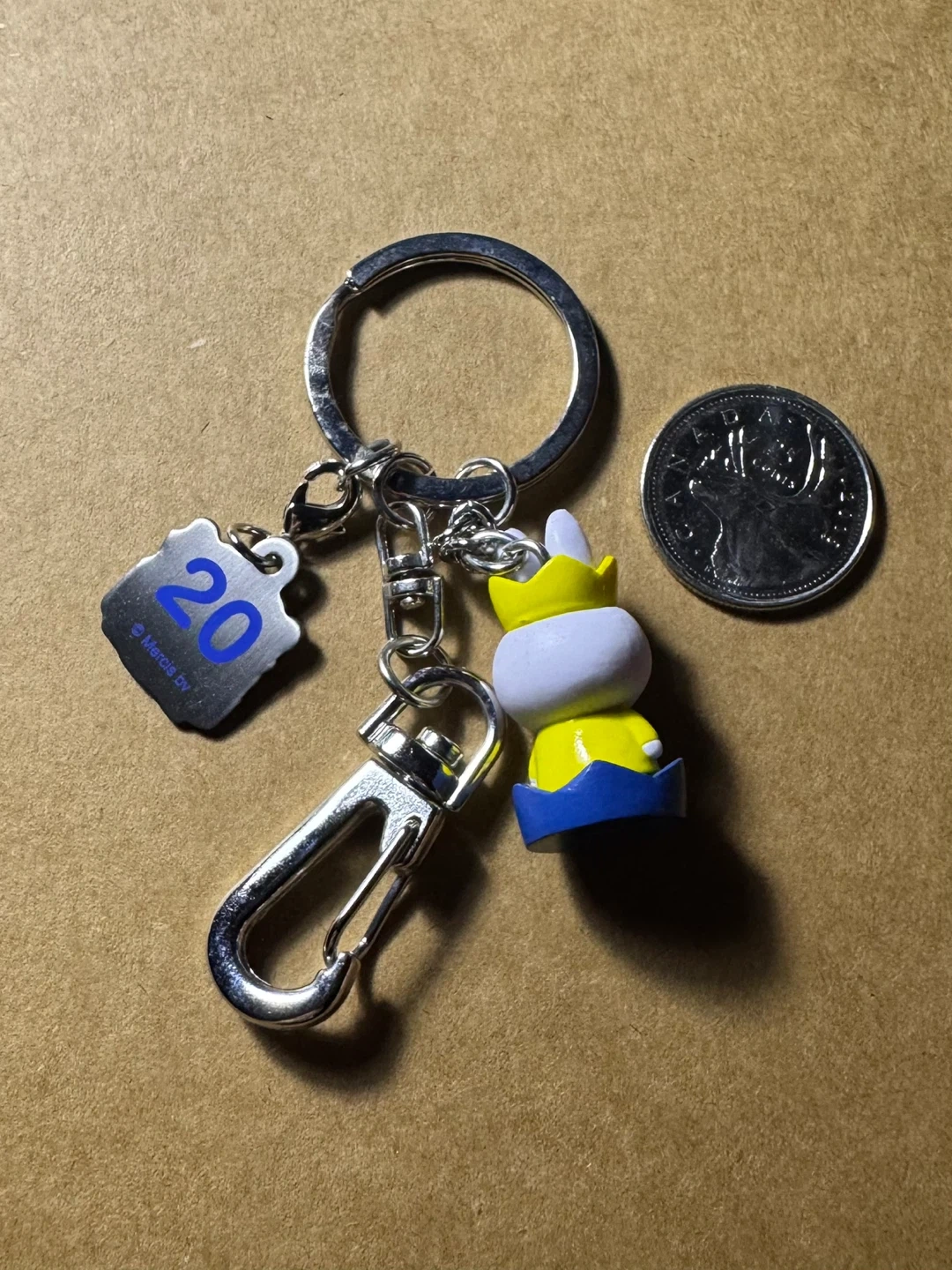 This Miffy keychain features a yellow Miffy figure with a crown, along with two decorative charms. One charm is a square with '20' printed on it. It's attached to a silver keyring with a carabiner clasp. A fun accessory for your keys or bag!