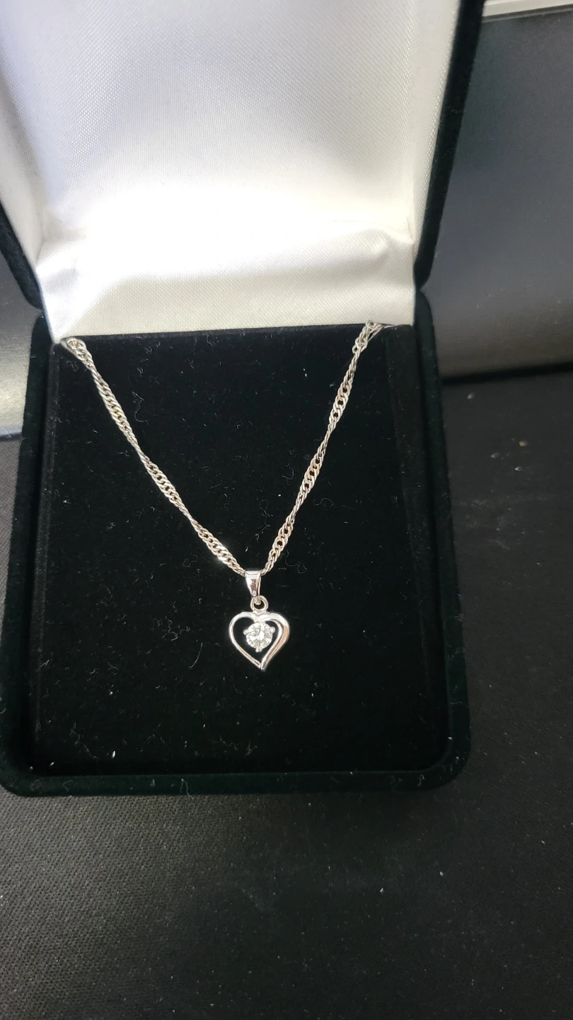 Silver-toned chain necklace with a heart-shaped pendant featuring a sparkling cubic zirconia. It comes in a black velvet jewelry box. This necklace is a lovely accessory for everyday wear or special occasions!