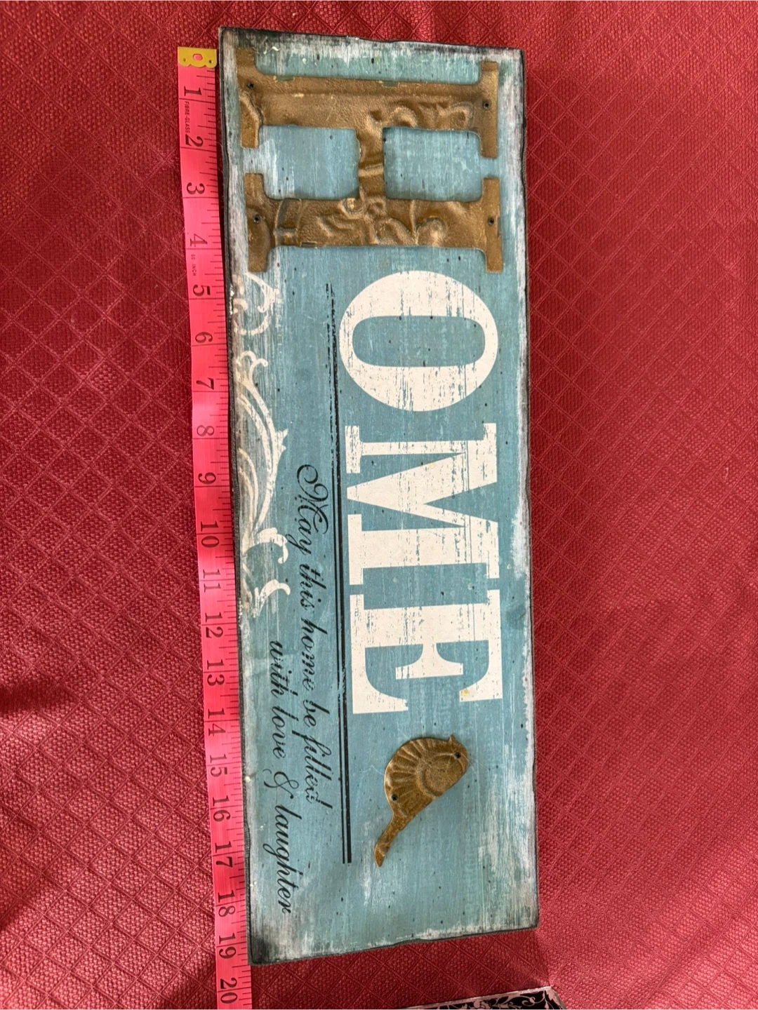 Wooden sign with decorative "HOME" lettering and a small bird accent. It has the phrase "May this home be filled with love & laughter" on the front. Measures approximately 20 inches tall and 6 inches wide. Includes hanging hardware on the back.