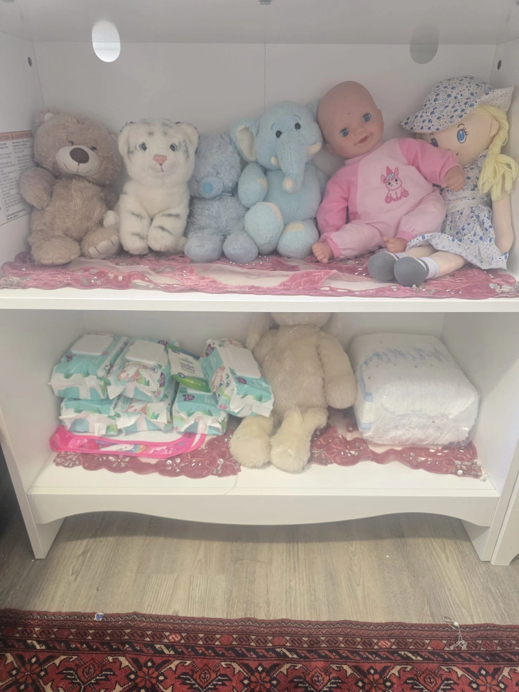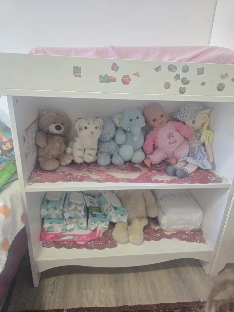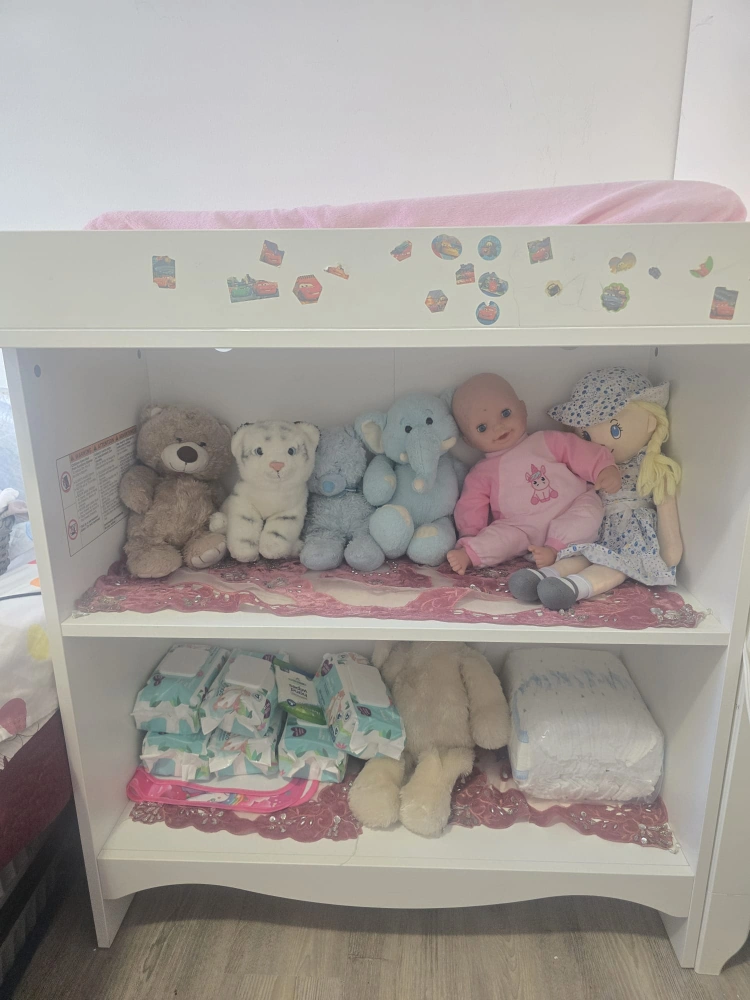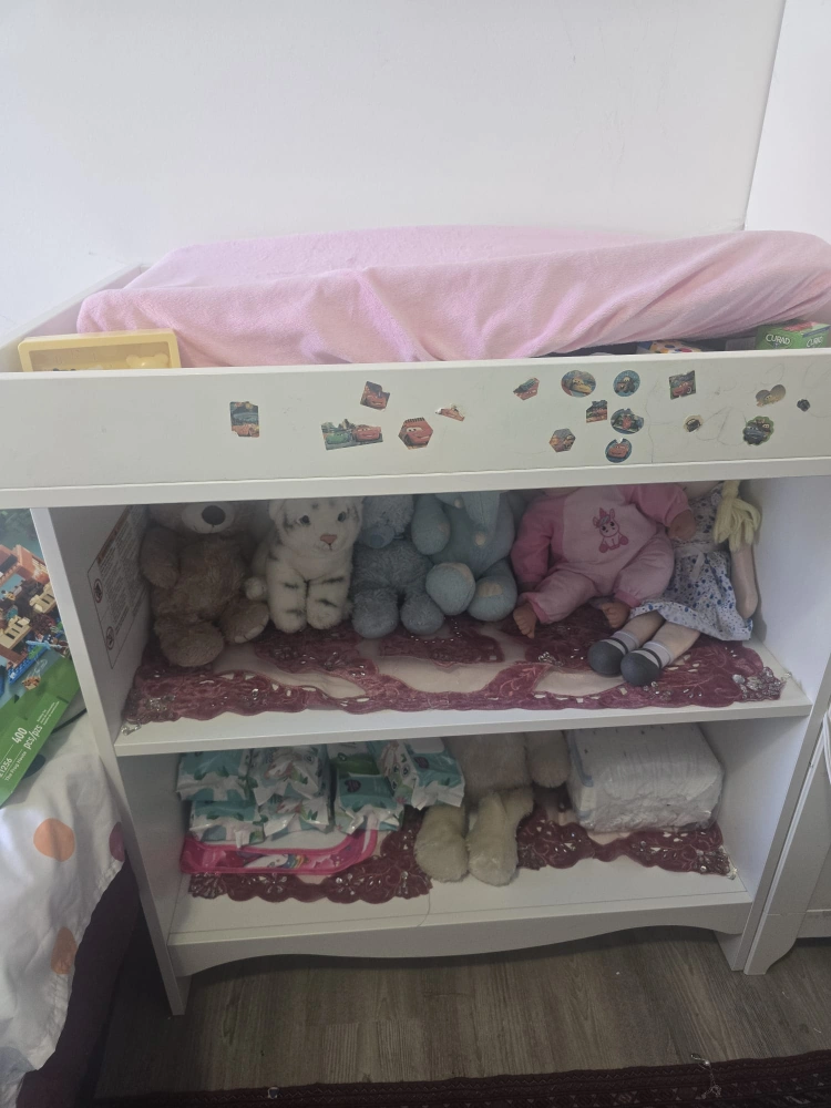 I'm selling a baby changing table that comes with a shelf. It's perfect for storing diapers, wipes, and other baby essentials. The table is in good condition and ready for a new home. Great for keeping everything organized during diaper changes!