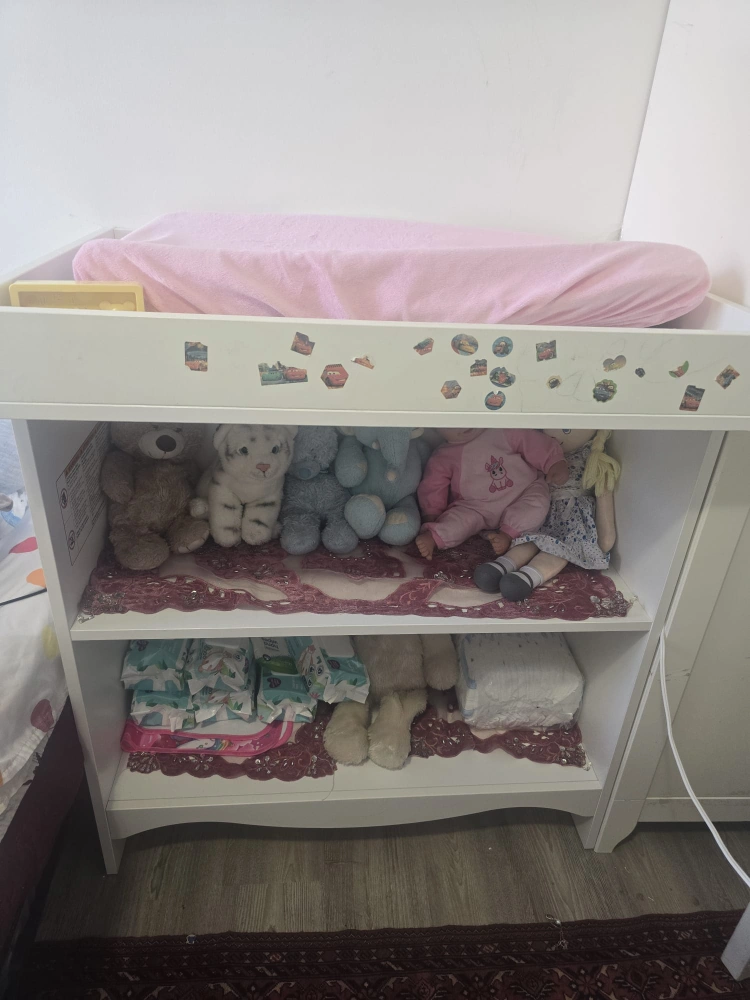 I'm selling a baby changing table that comes with a shelf. It's perfect for storing diapers, wipes, and other baby essentials. The table is in good condition and ready for a new home. Great for keeping everything organized during diaper changes!