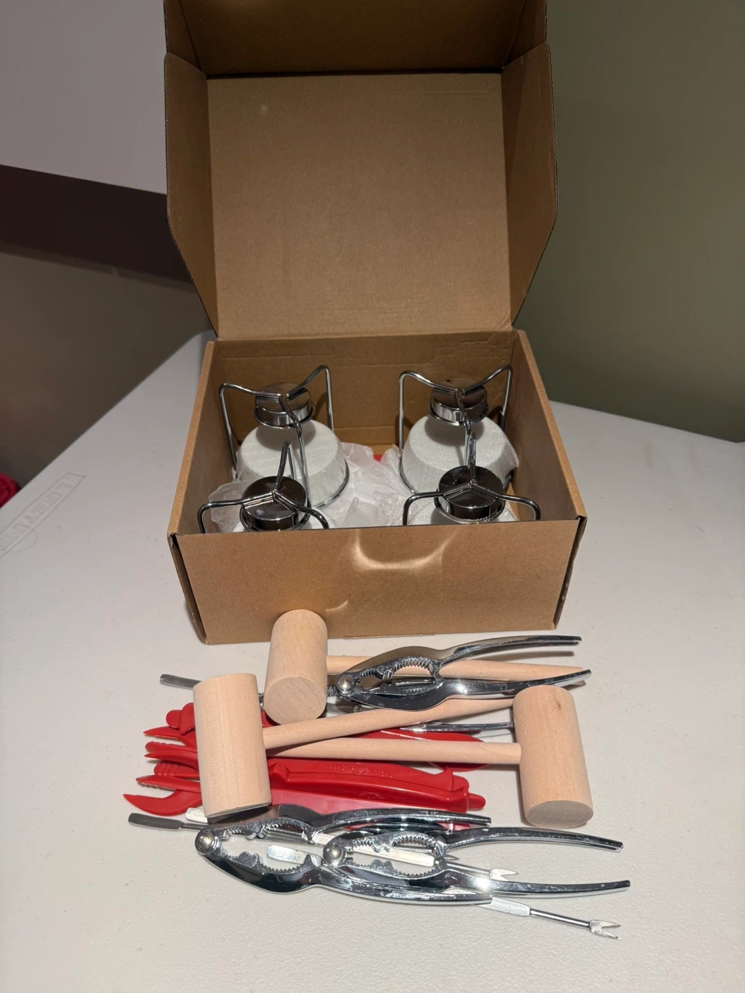 Here's a crab cracker and mallet set, complete with all the tools (for 4) you need for a delicious seafood feast! Includes butter warmers. The set includes crackers, mallets, and other accessories to make cracking and enjoying crabs a breeze.
