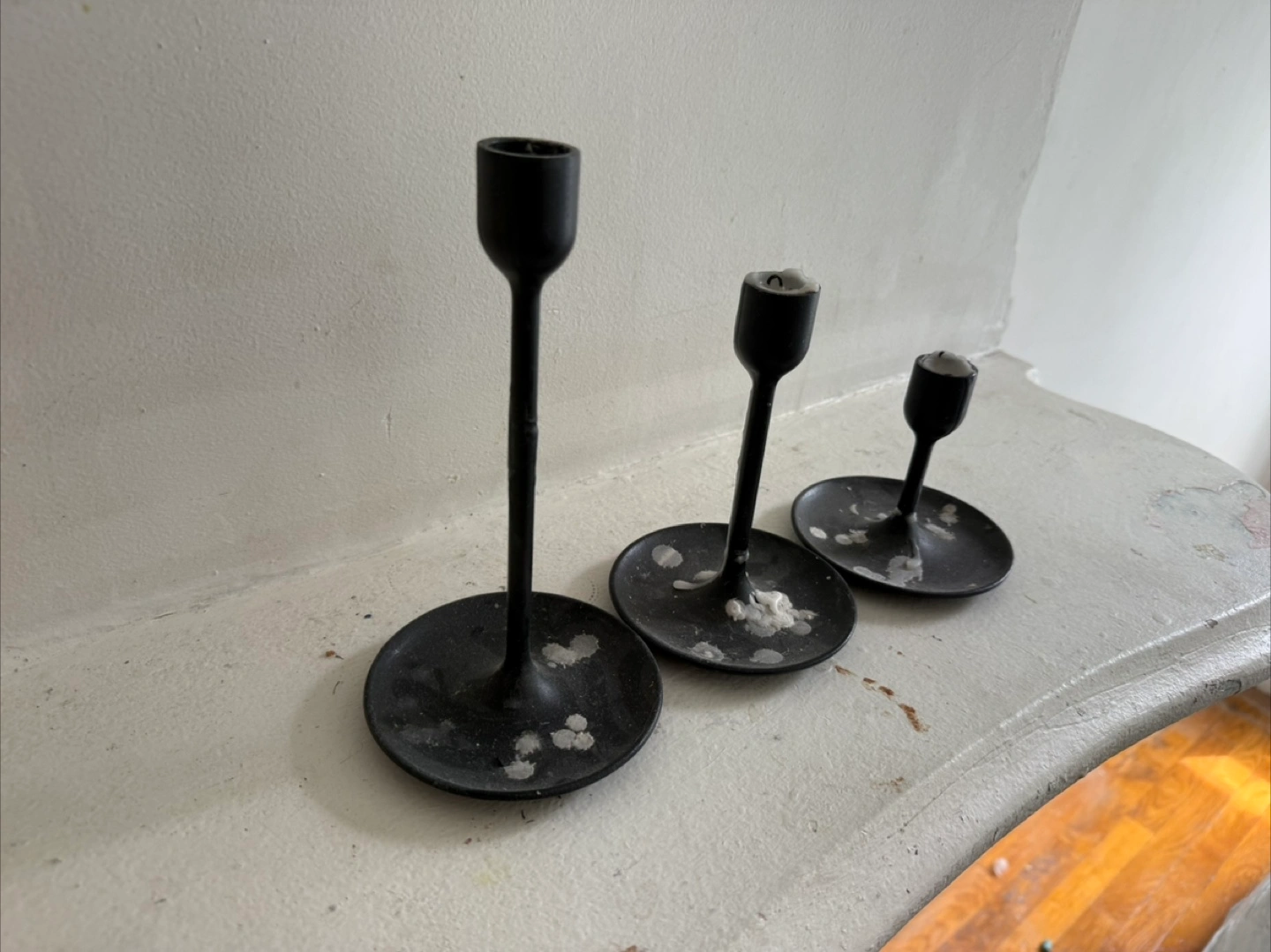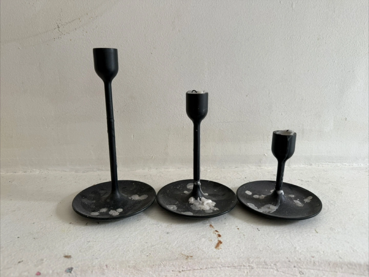 Three black metal candlesticks, varying heights. Small, medium, and large sizes. Wax residue present.