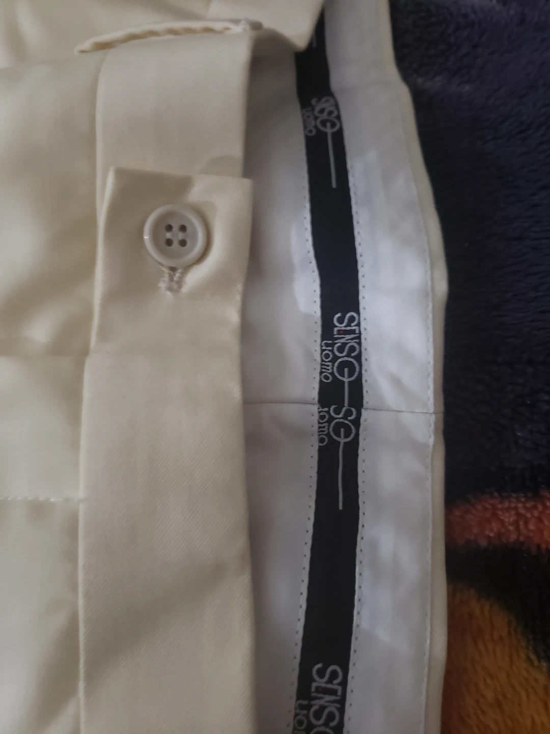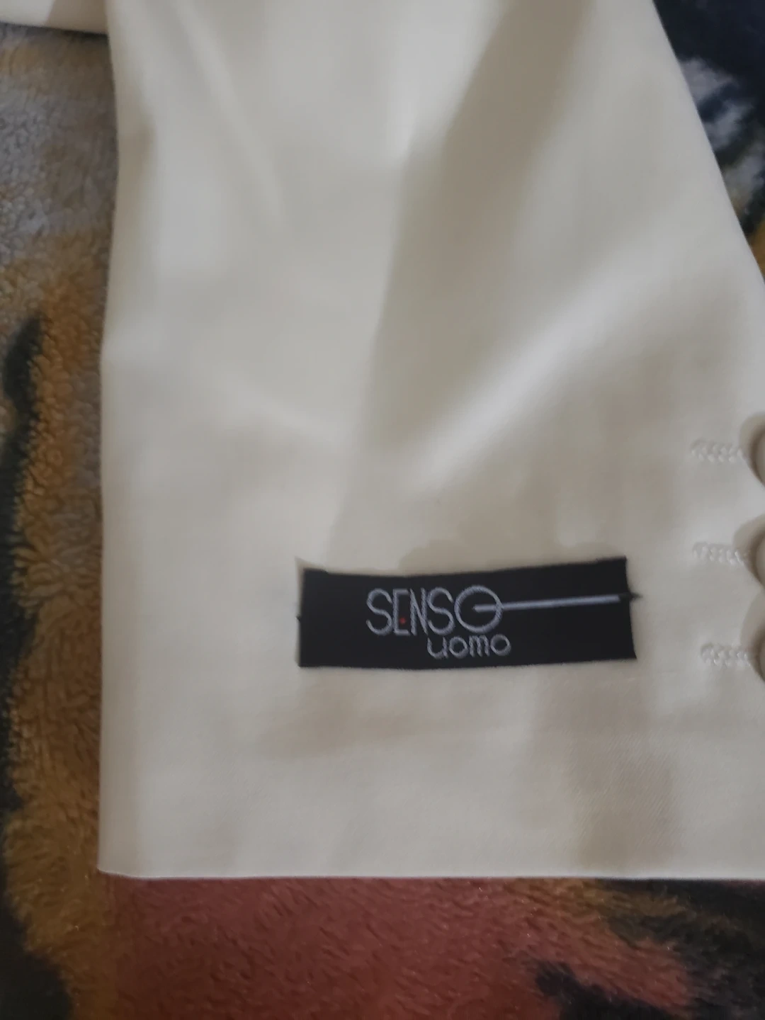 This is a cream-coloured men's suit set from SENSE UOMO. It includes a jacket and pants. The jacket features a two-button closure and the pants have a classic fit. This suit would be great for formal occasions.