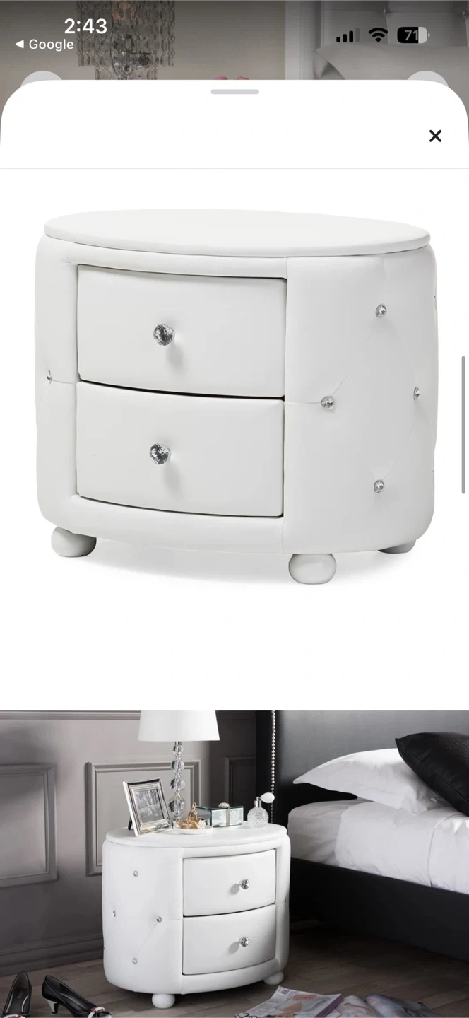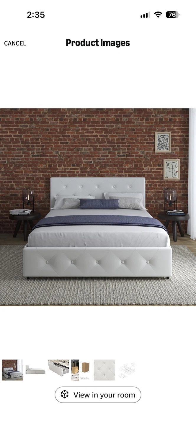 White upholstered bed frame with 4 built-in storage drawers, full-size mattress (used for under 2 years), and single nightstand (can buy another one on Amazon if needed).