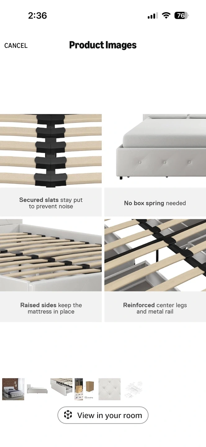 White upholstered bed frame with 4 built-in storage drawers, full-size mattress (used for under 2 years), and single nightstand (can buy another one on Amazon if needed).
