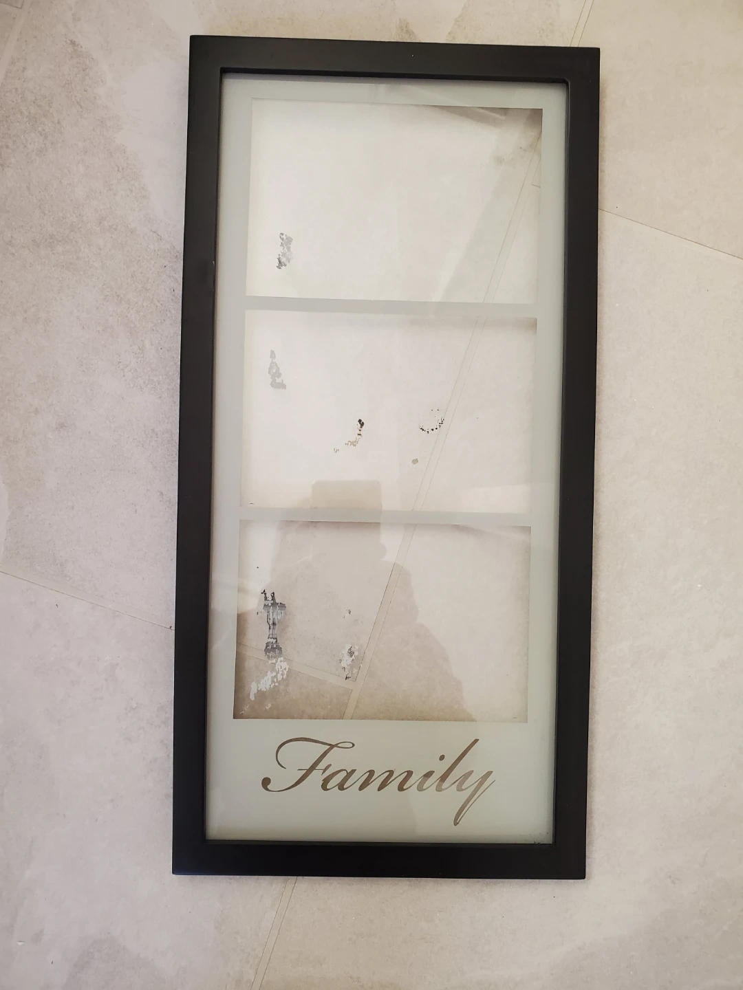 This photo frame holds three pictures. It has a black frame and a frosted glass panel with "Family" etched on it. Frame is approximately 12 inches tall.