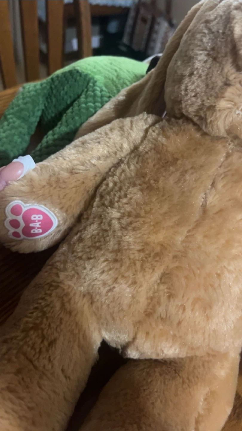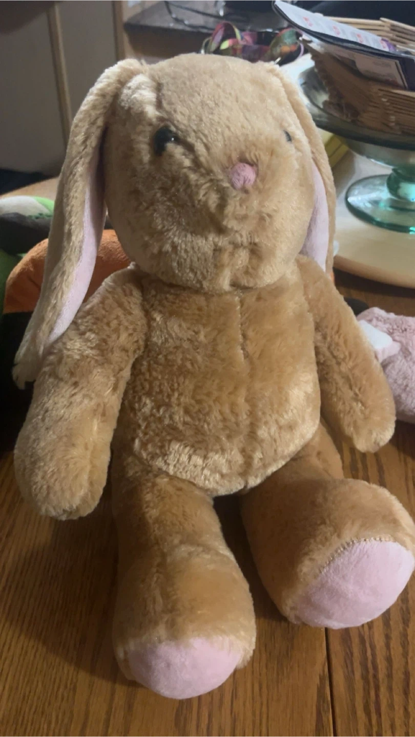 This is a soft, brown plush bunny from Build-A-Bear Workshop. It has pink accents on its ears and paws. It's a cuddly friend perfect for kids!