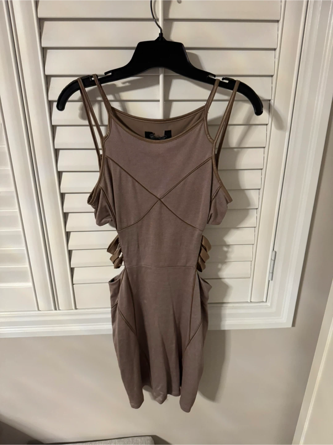 Selling a cute brown mini dress! It has a unique design with cutout details on the sides. It's in great condition and perfect for a night out or a special occasion