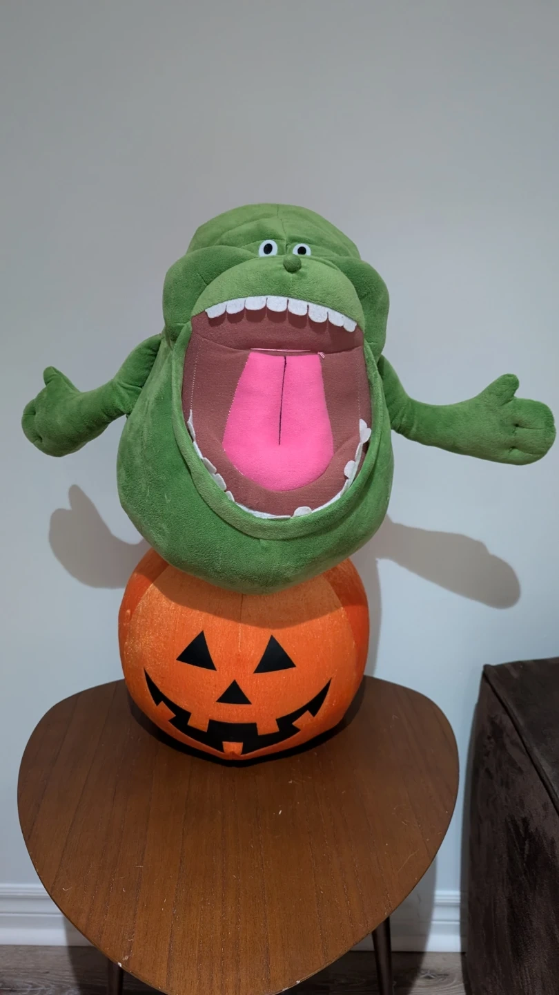 Here's a fun Slimer from Ghostbusters sitting atop a pumpkin! It's a plush toy, perfect for any fan of the movie