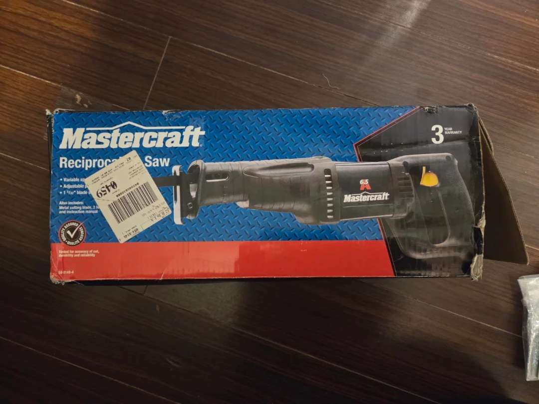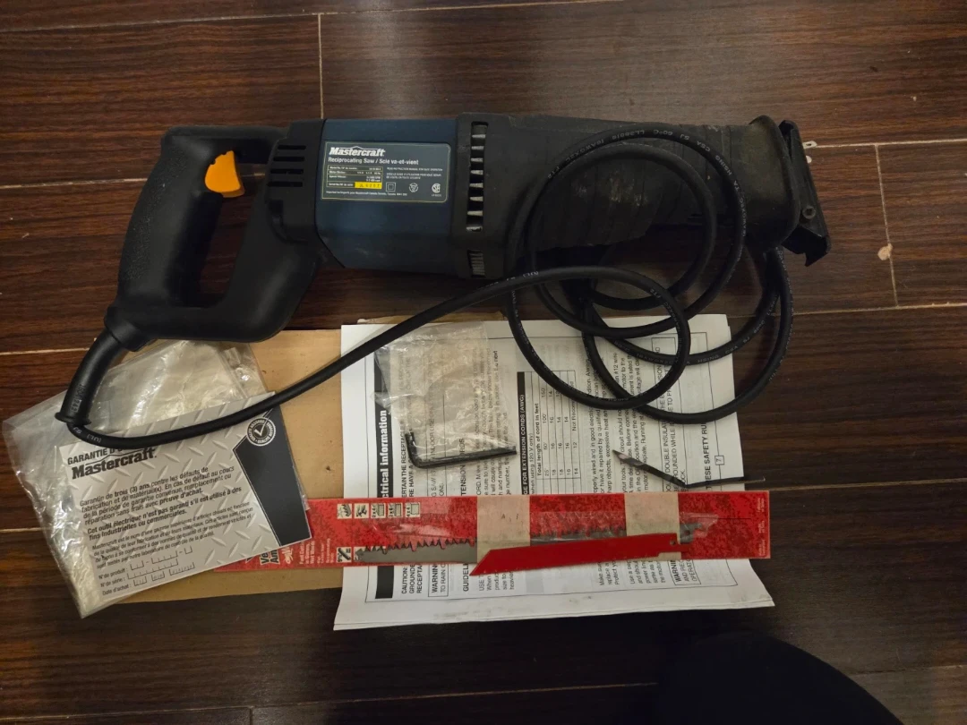 Mastercraft reciprocating saw with variable speed and adjustable shoe. Also includes a metal cutting blade, 2 hex keys, and instruction manual.