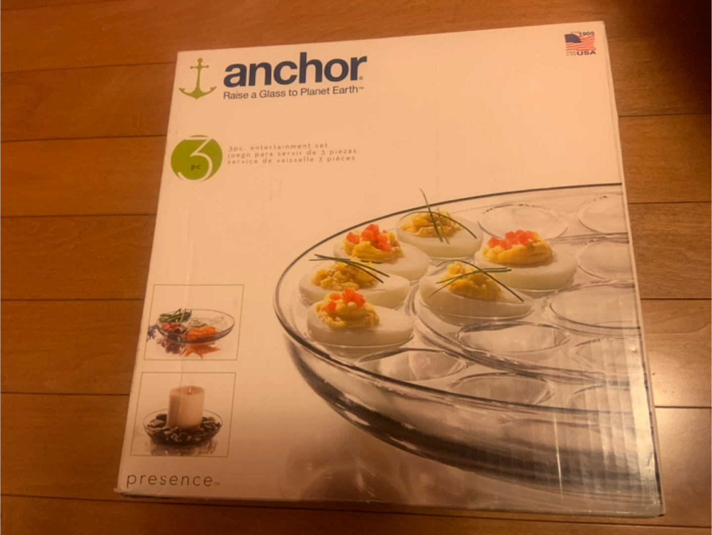 Selling a brand new Anchor 3-piece entertainment set, still in its original box! It includes a 12-inch deep serving tray, a 14-count egg platter, and a 3-section divided insert. Perfect for your next gathering!