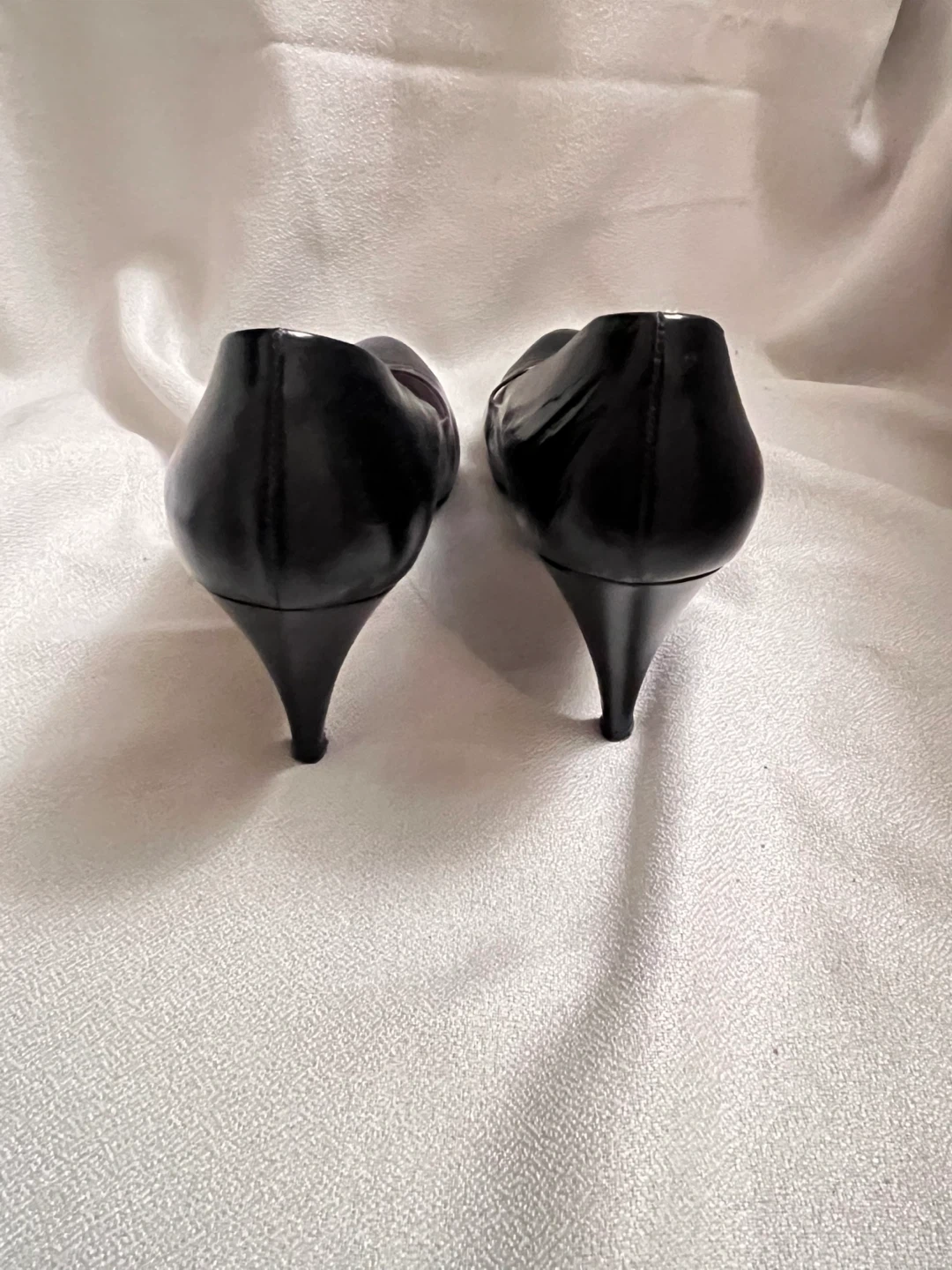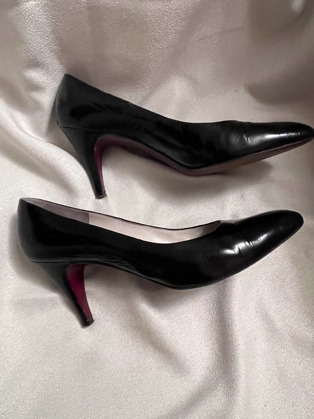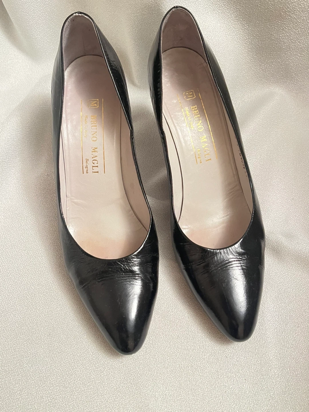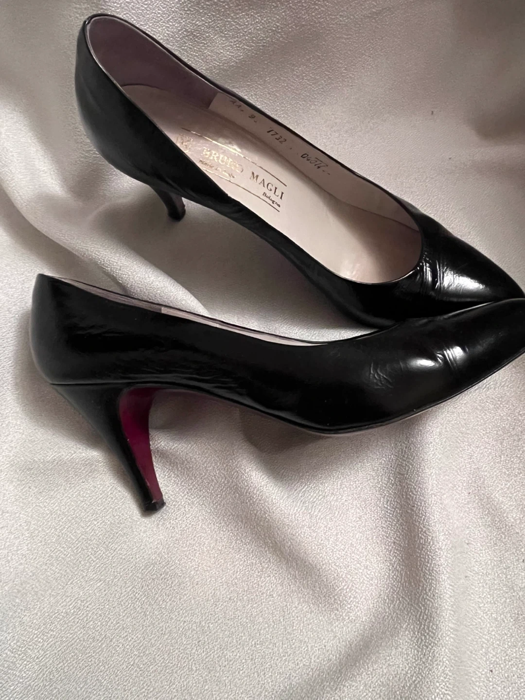 Authentic Classic black sheen leather pumps from Bruno Magli. Features a pointed toe and a comfortable heel.