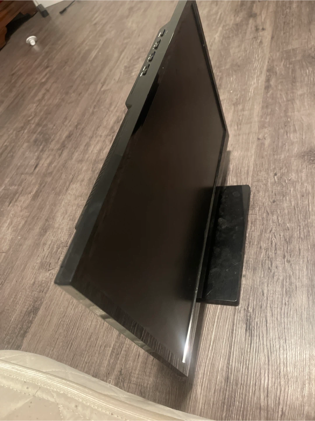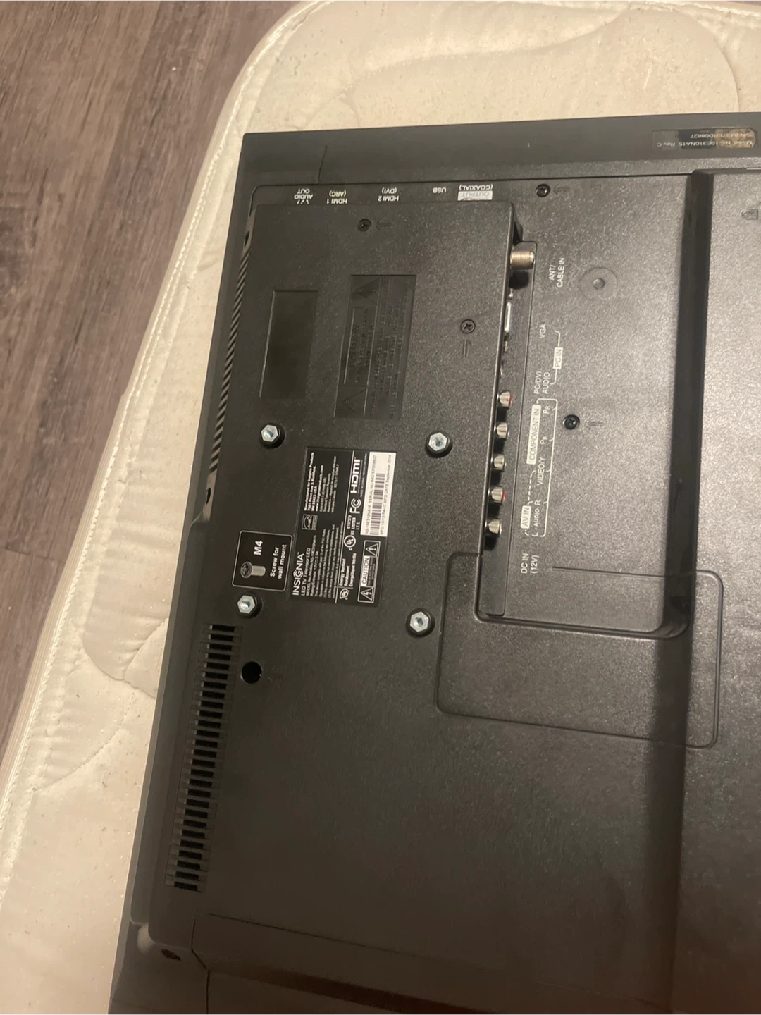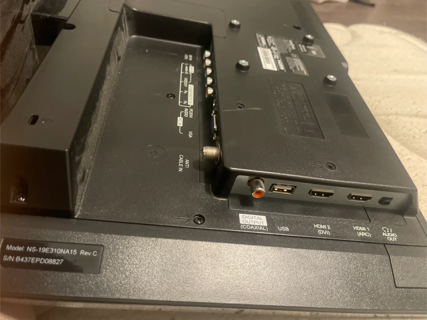 This is an Insignia 19-inch LED TV. It's a black flat screen with a stand. The TV has HDMI, DVI, VGA, and USB inputs.