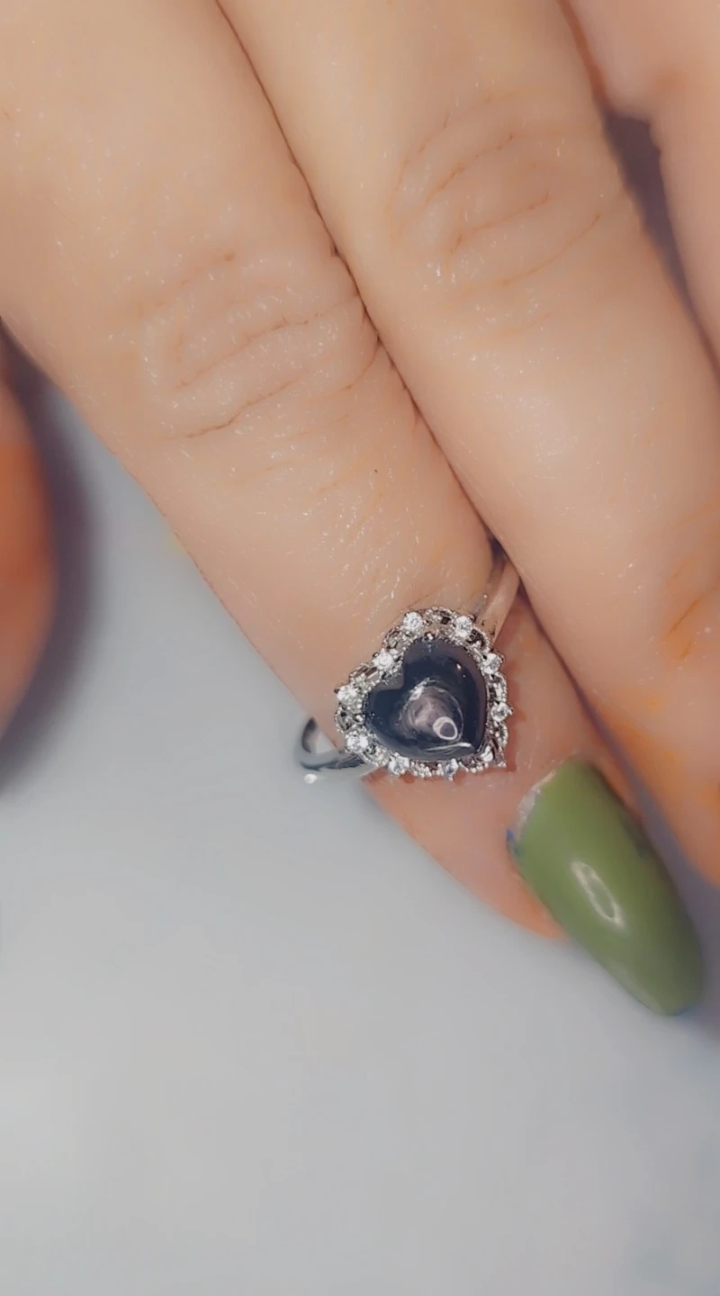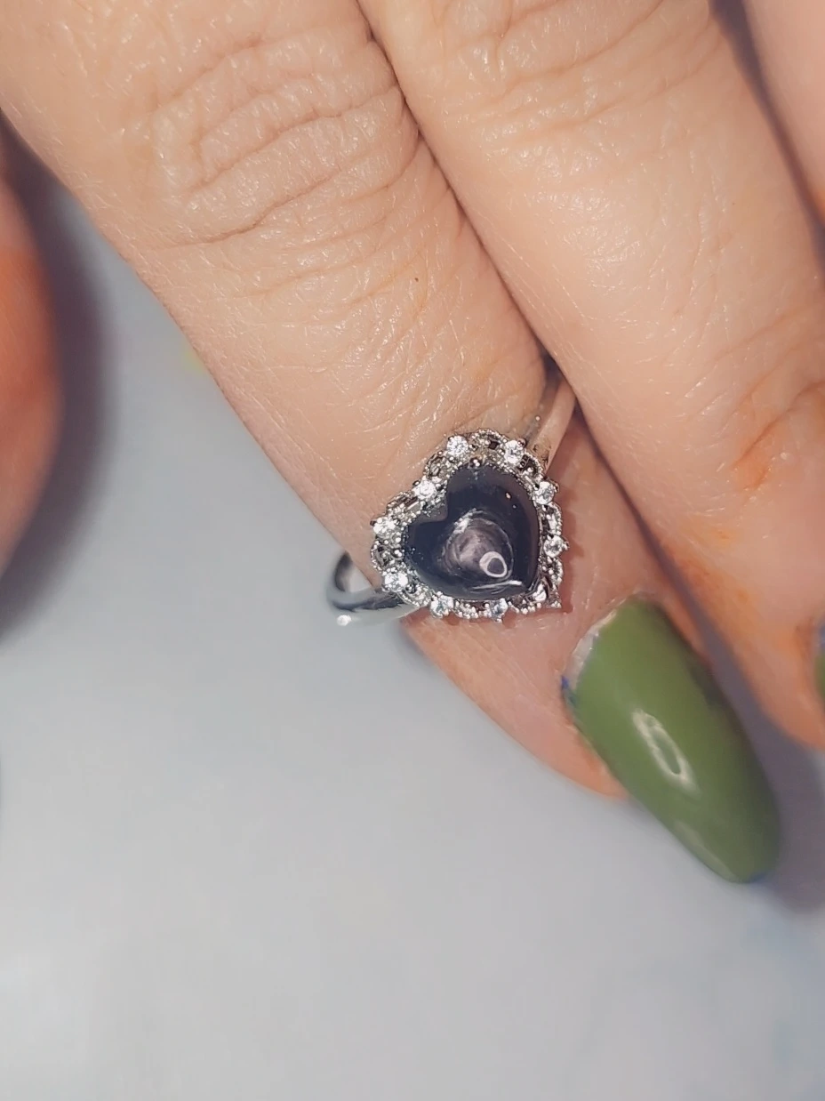 This silver-toned ring features a dark heart-shaped black obsidien stone surrounded by smaller clear accent stones. It's a lovely piece for everyday wear or special occasions. or a valentines gift
