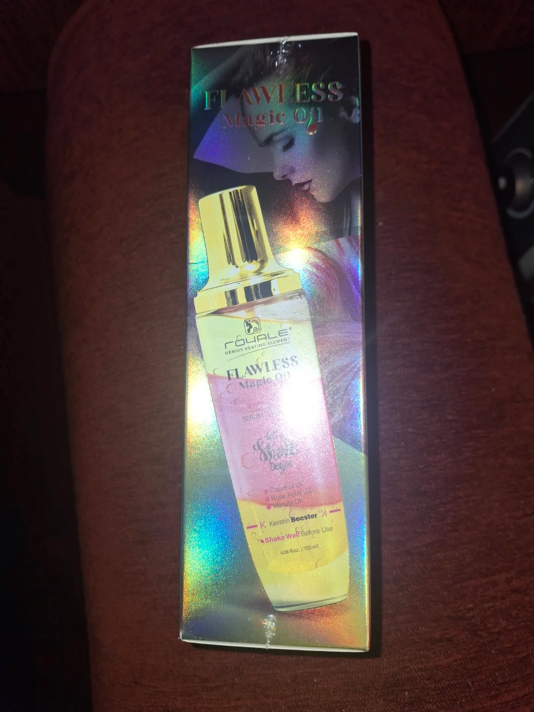 Selling a Royale Flawless Magic Oil Serum! It's a serum with coconut oil, rose petal oil, and marula oil. It also contains K Keratin Booster. The bottle contains 4.06 fl oz / 120 ml. Shake well before use