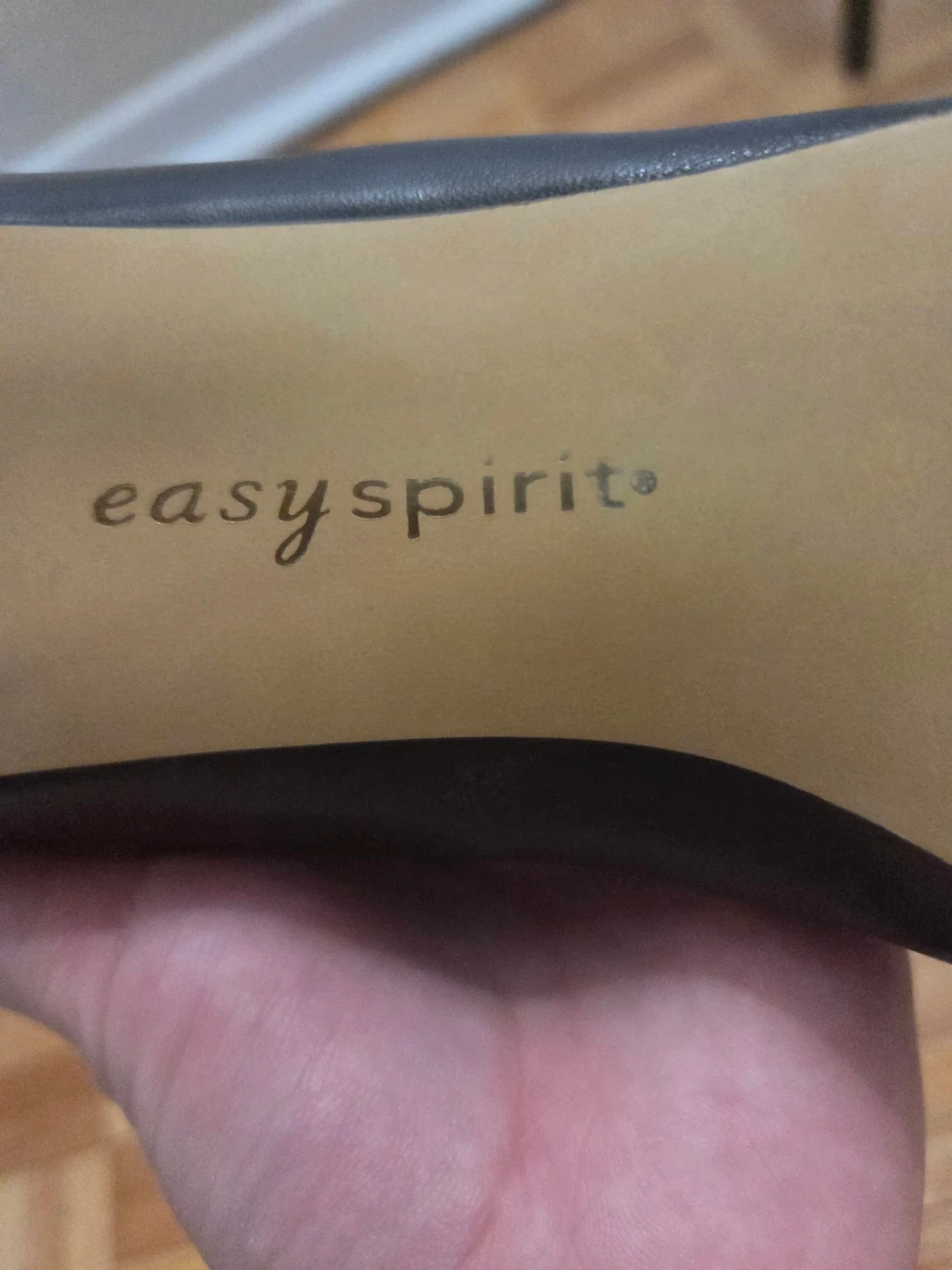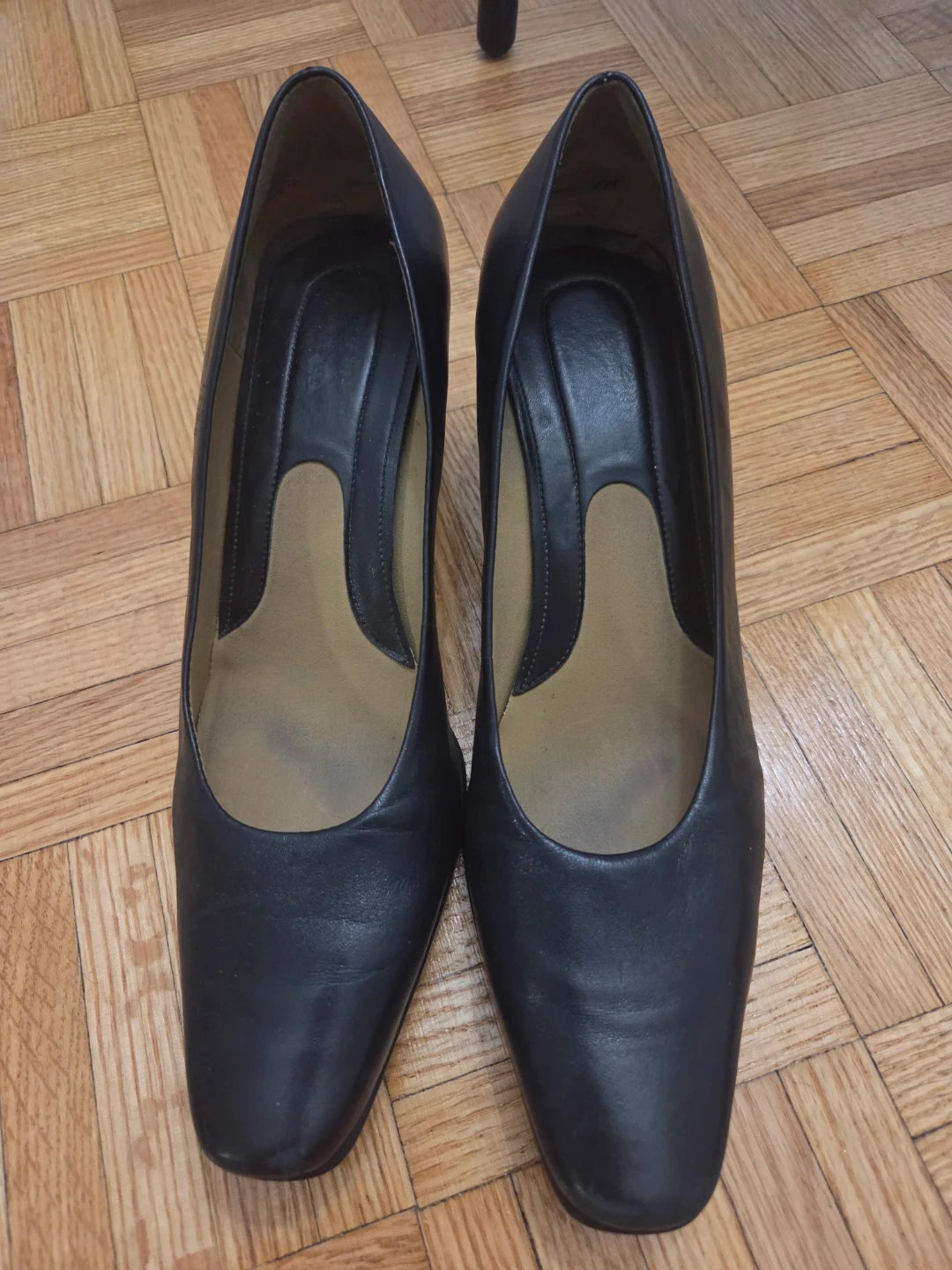 Easy Spirit women's black leather high heel pumps. These classic pumps feature a stylish square toe. Some wear on the soles and heels, consistent with use.