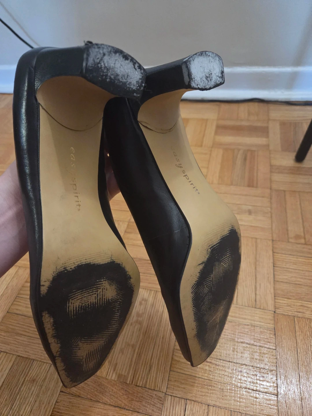 Easy Spirit women's black leather high heel pumps. These classic pumps feature a stylish square toe. Some wear on the soles and heels, consistent with use.