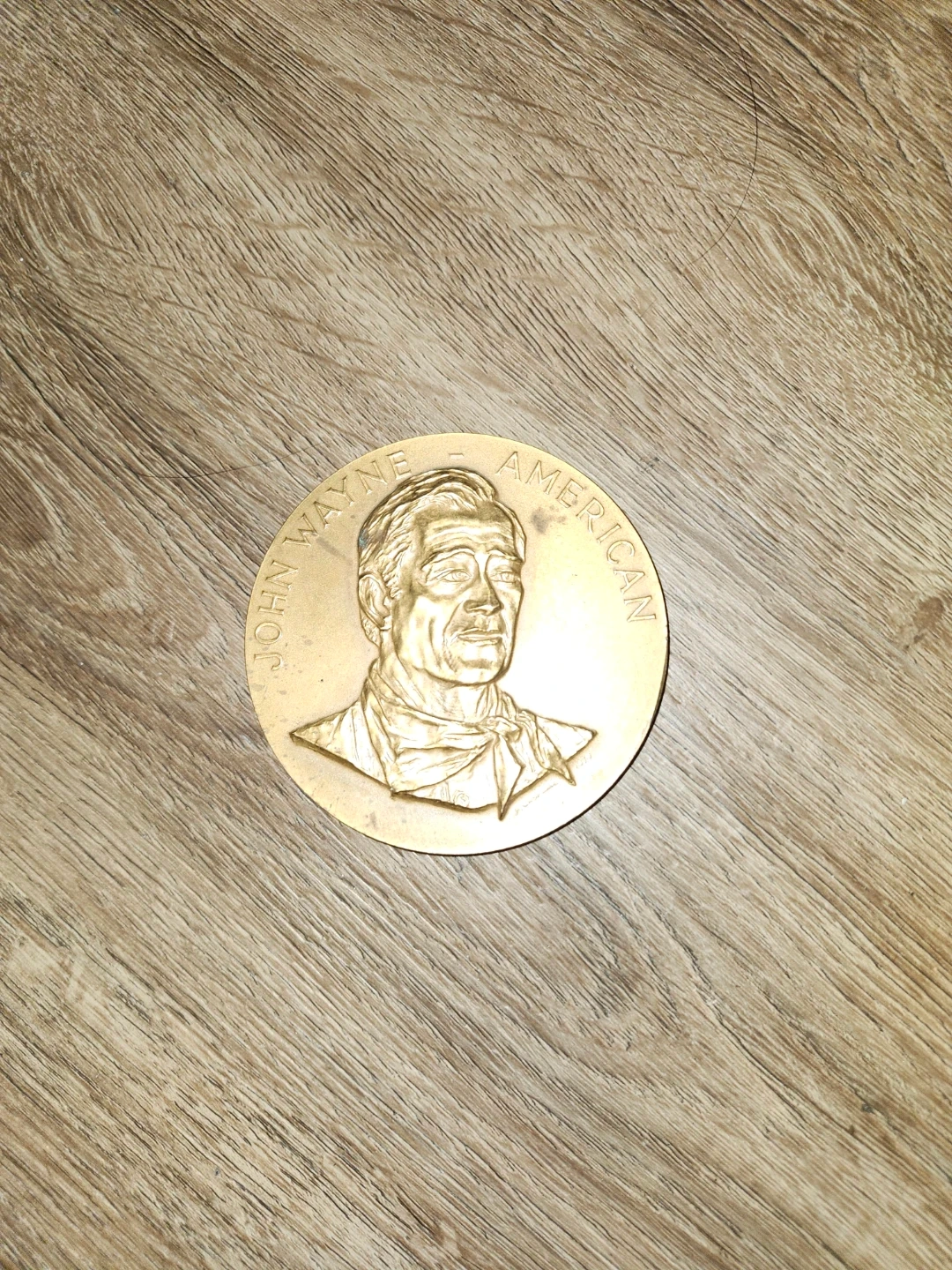 Commemorative medal featuring John Wayne. One side shows his portrait with "John Wayne American" text. The reverse depicts a cowboy on horseback.
