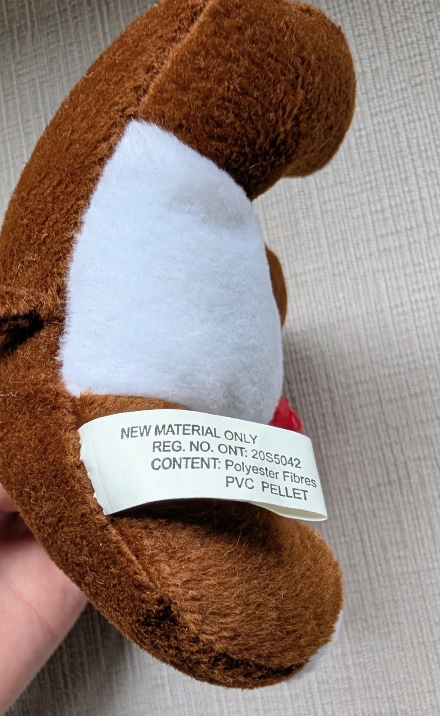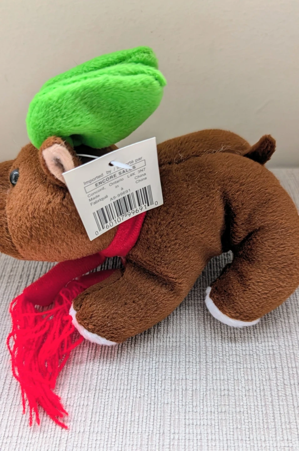 Brown plush reindeer toy with a red fringed scarf and a green hat. It's filled with polyester fibres and PVC pellet. New material only registration number is 20S5042.