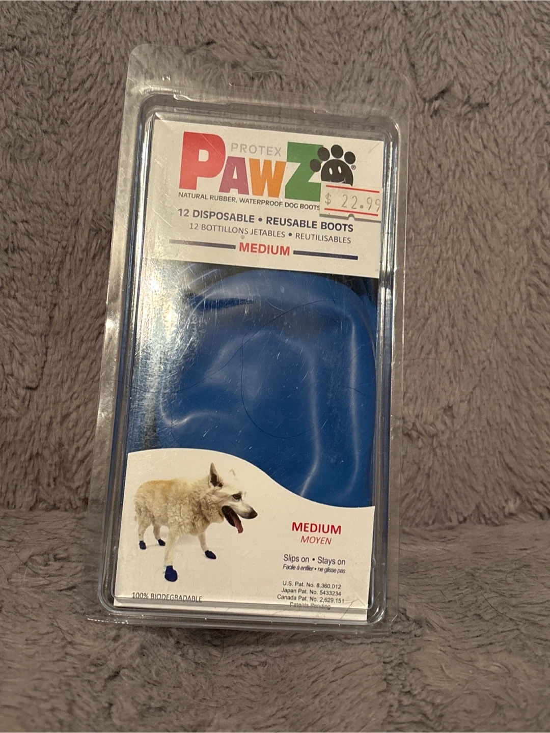 Selling a pack of new Pawz natural rubber, waterproof dog boots in medium size! These are disposable and reusable, perfect for protecting your furry friend's paws from ice, snow, allergies, and more. They're designed to slip on and stay on, and are 100% biodegradable. The original price was $22.99.