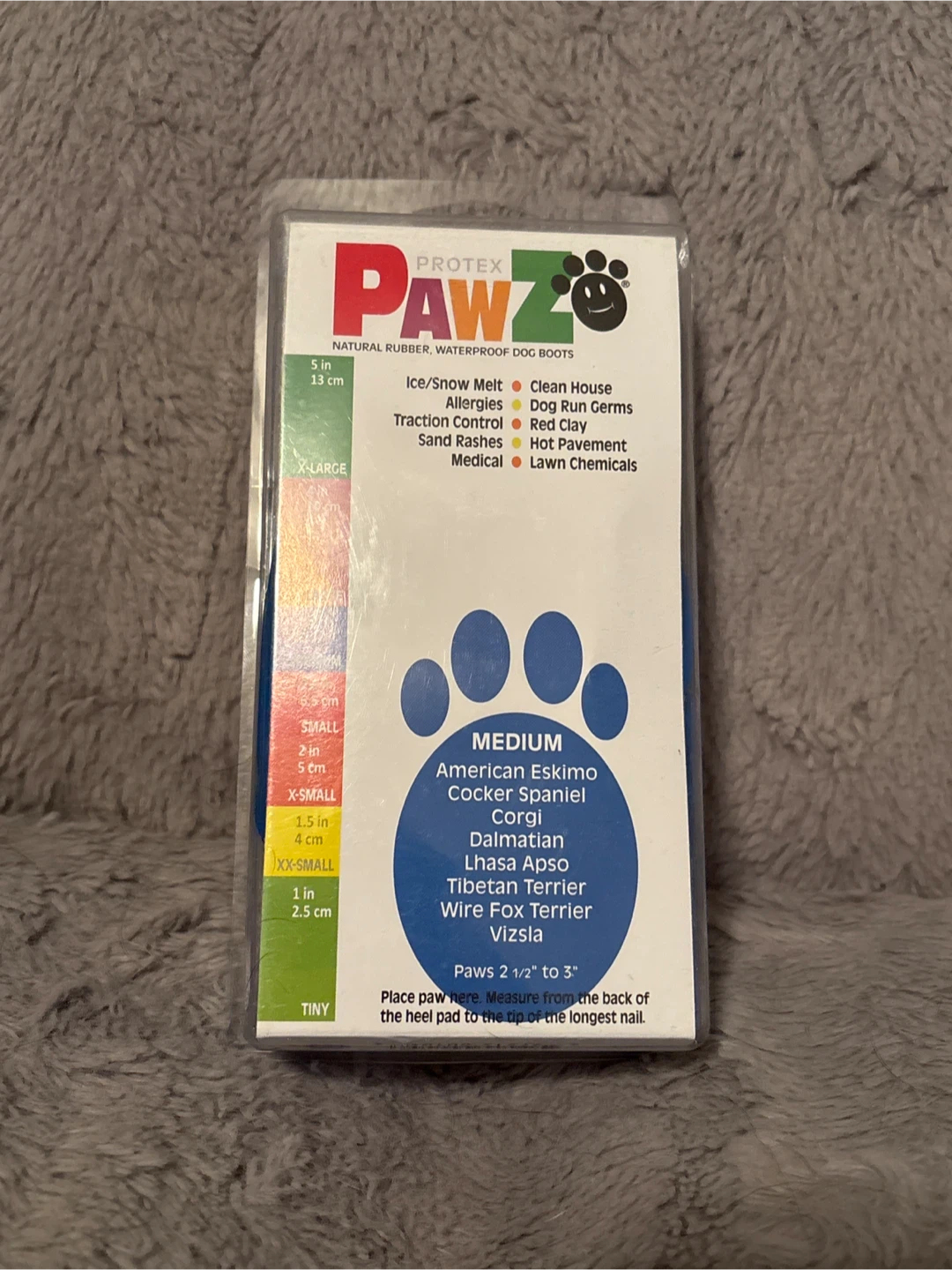 Selling a pack of new Pawz natural rubber, waterproof dog boots in medium size! These are disposable and reusable, perfect for protecting your furry friend's paws from ice, snow, allergies, and more. They're designed to slip on and stay on, and are 100% biodegradable. The original price was $22.99.