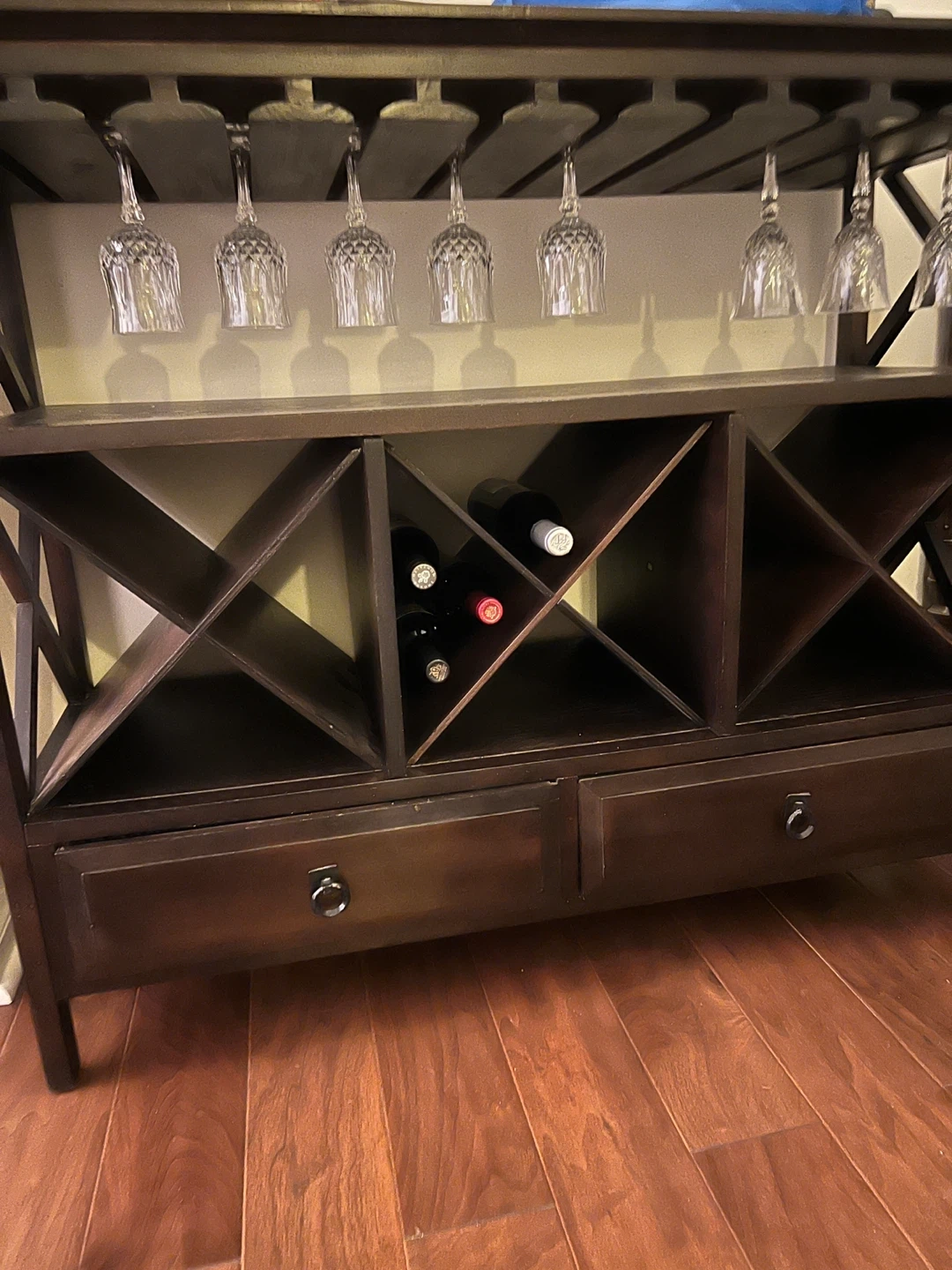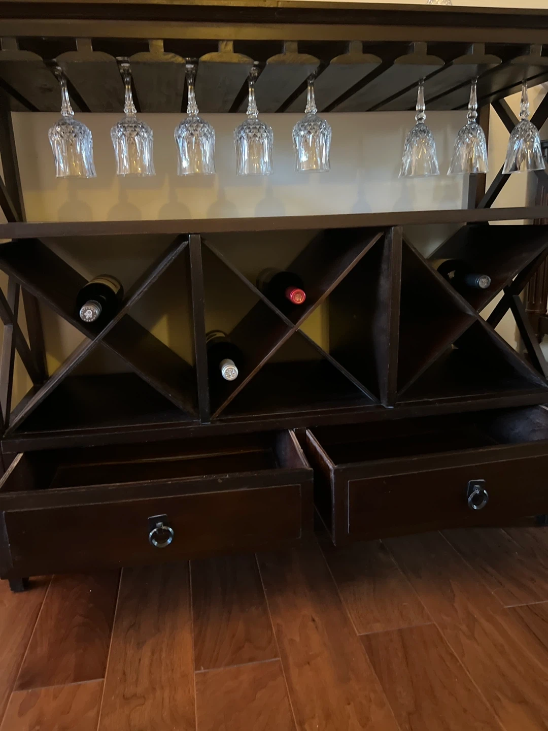 Here's a lovely dark brown wine rack cabinet! It features a rack for wine glasses and storage for wine bottles. It also has two drawers for extra storage. This piece would be a great addition to any dining room or living room!