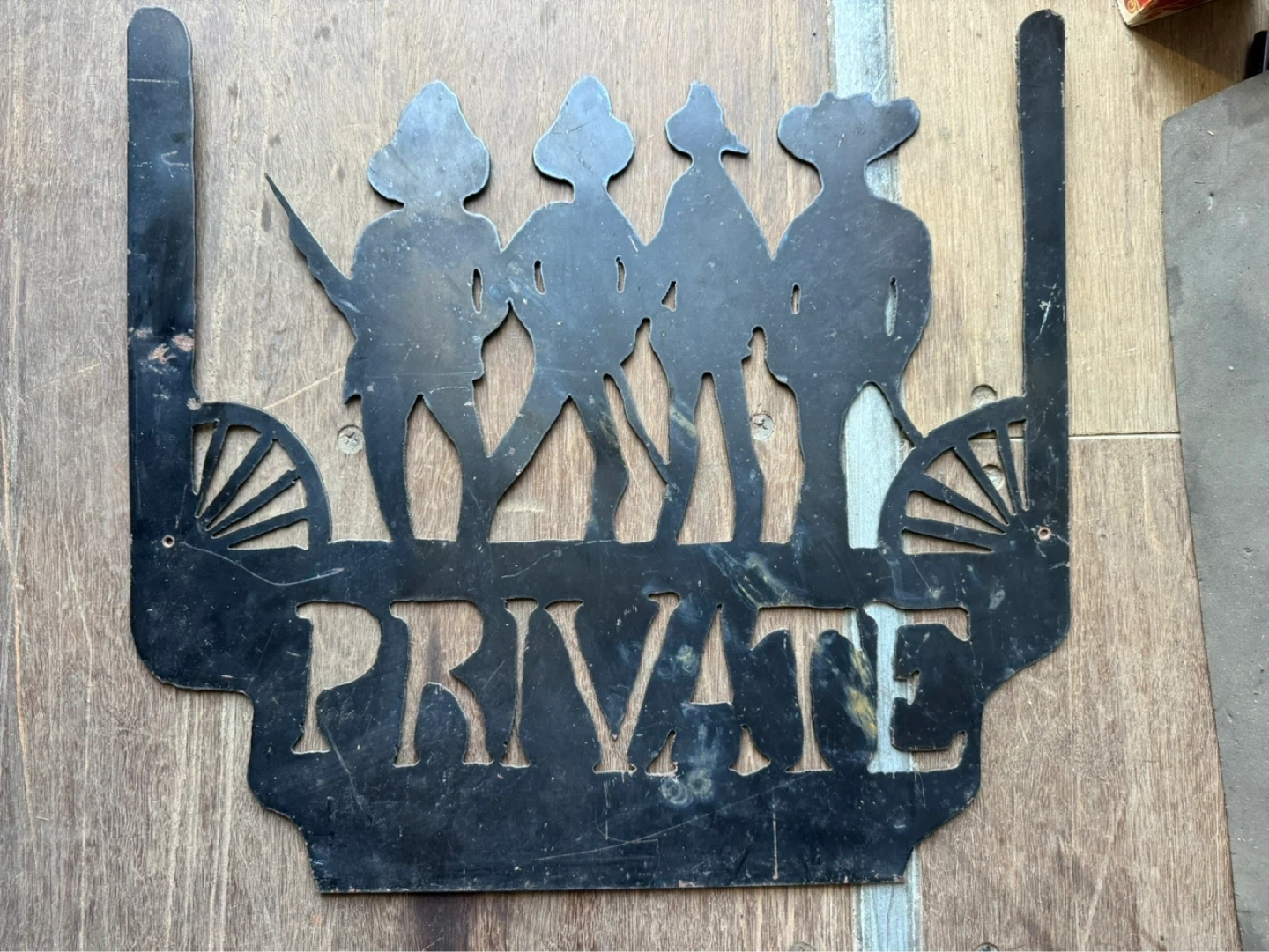 This is a rustic metal sign with the word "PRIVATE" cut out. It depicts four silhouetted figures and decorative wheels. Made of black metal, it's suitable for outdoor or indoor display. 21” x 19 1/2”. $50.