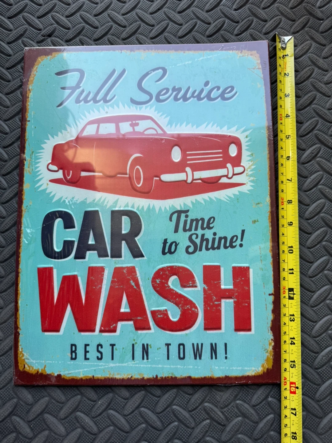 Retro style tin sign featuring a 'Full Service CAR WASH TIME to Shine!' graphic. 'BEST IN TOWN!' text at the bottom. This decorative sign is perfect for a garage or workshop! 16” x 12” . $30. Located in Oliver