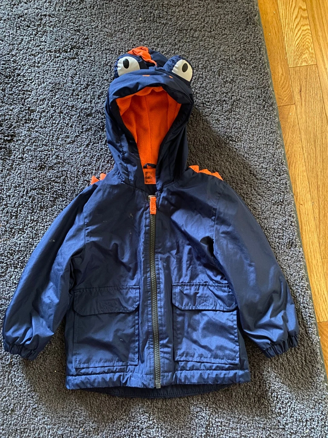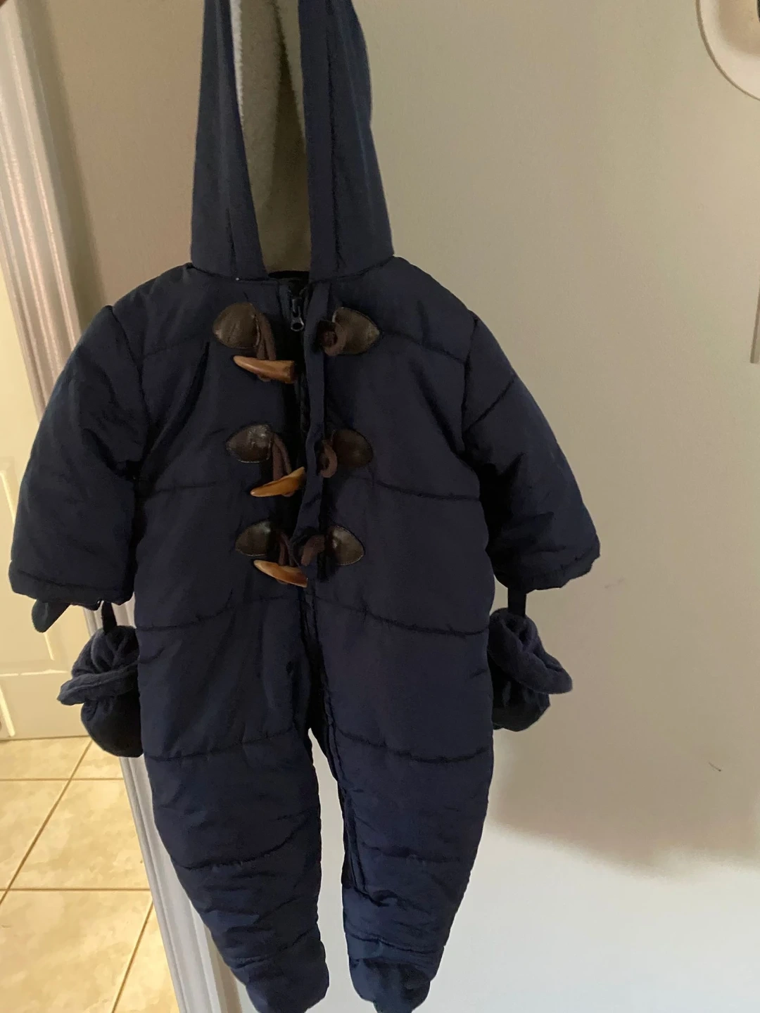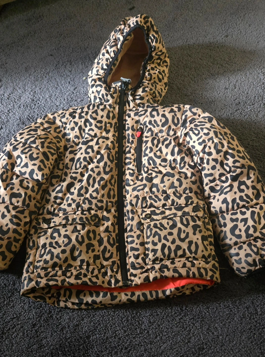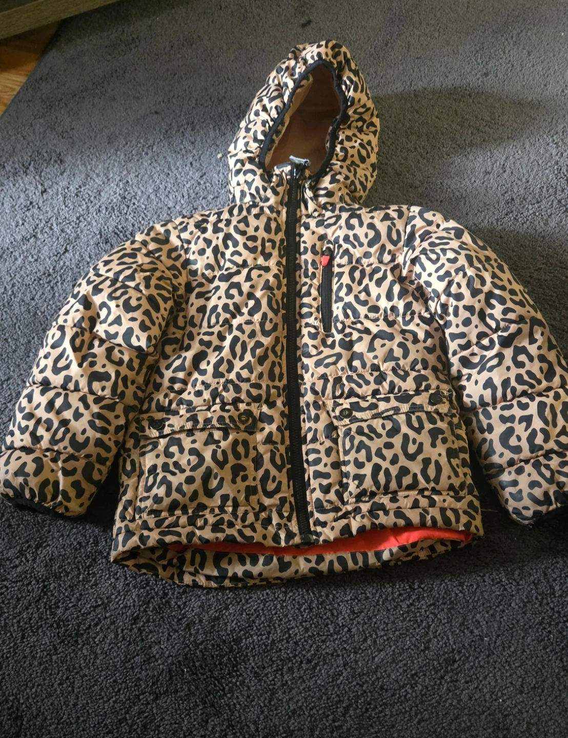 Bundle includes a leopard print hooded puffer jacket and a navy blue toggle snowsuit with attached mittens. Both are warm and perfect for keeping little ones cozy during colder months.