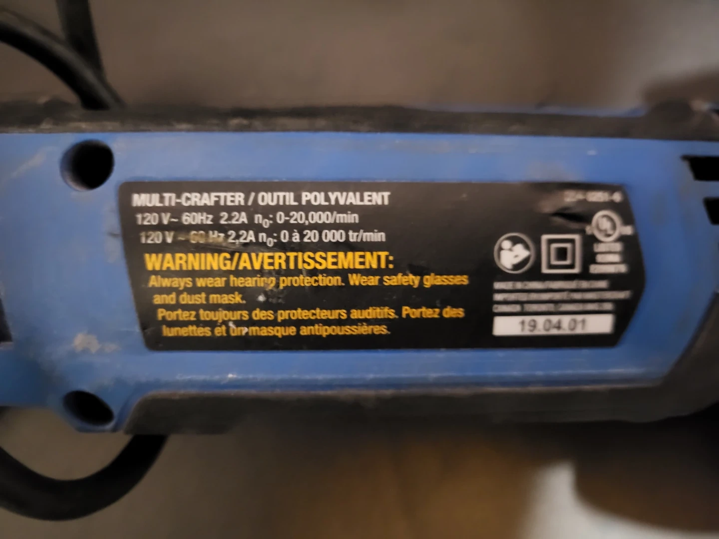 This Mastercraft multi-crafter is a versatile oscillating tool for various cutting and sanding tasks. It operates on 120V and has a no-load speed of 0-20,000 RPM. Always wear safety glasses and dust mask when operating.