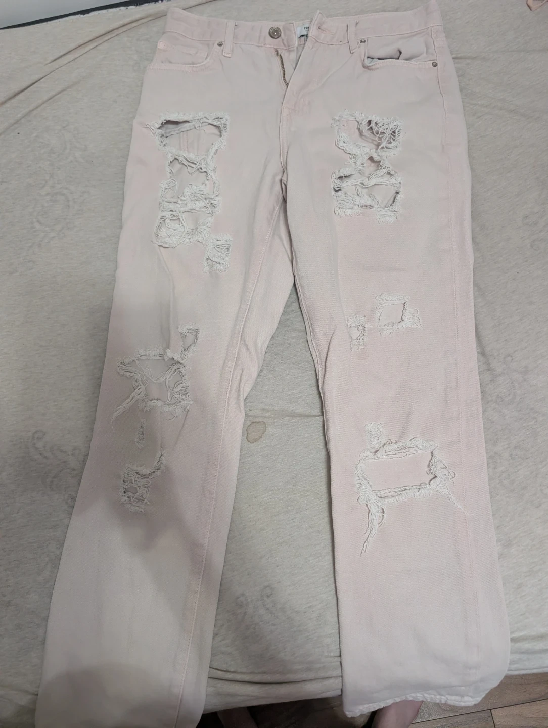 Selling a pair of Forever 21 distressed jeans. They are light pink and have a good amount of rips and tears for a stylish look!
