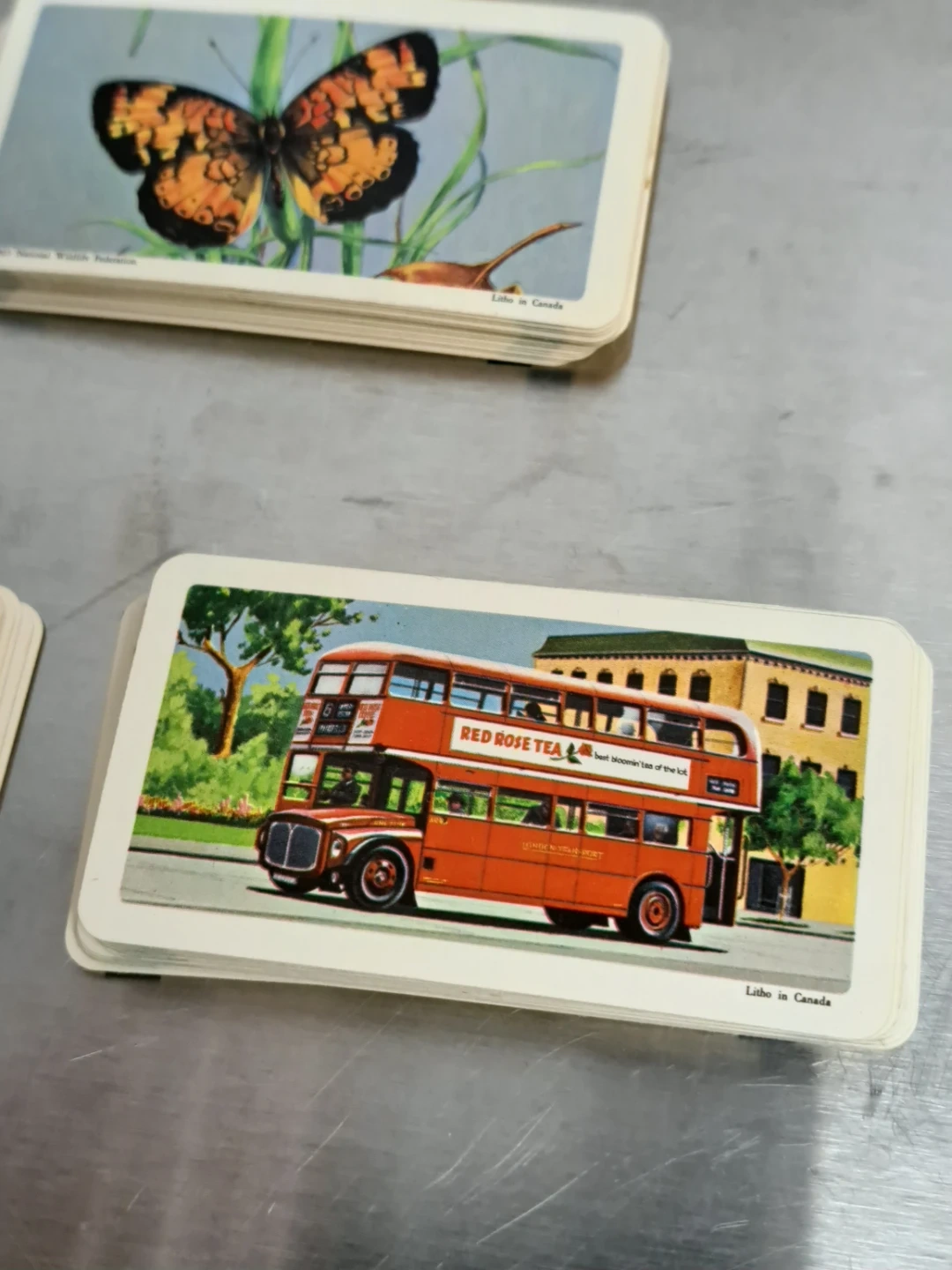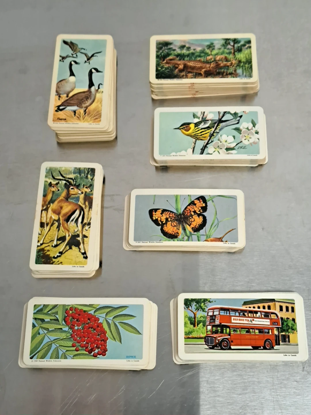This is a lot of 190 vintage Red Rose Tea album cards featuring various nature scenes and Canadian themes. You'll find images of geese, antelopes, a yellow bird, a butterfly, dinosaurs, rowan berries, and a classic red double-decker bus. These cards are perfect for collectors or anyone interested in nature and Canadian memorabilia.