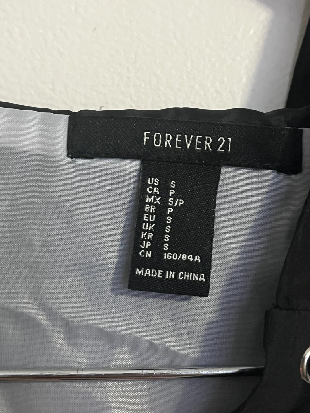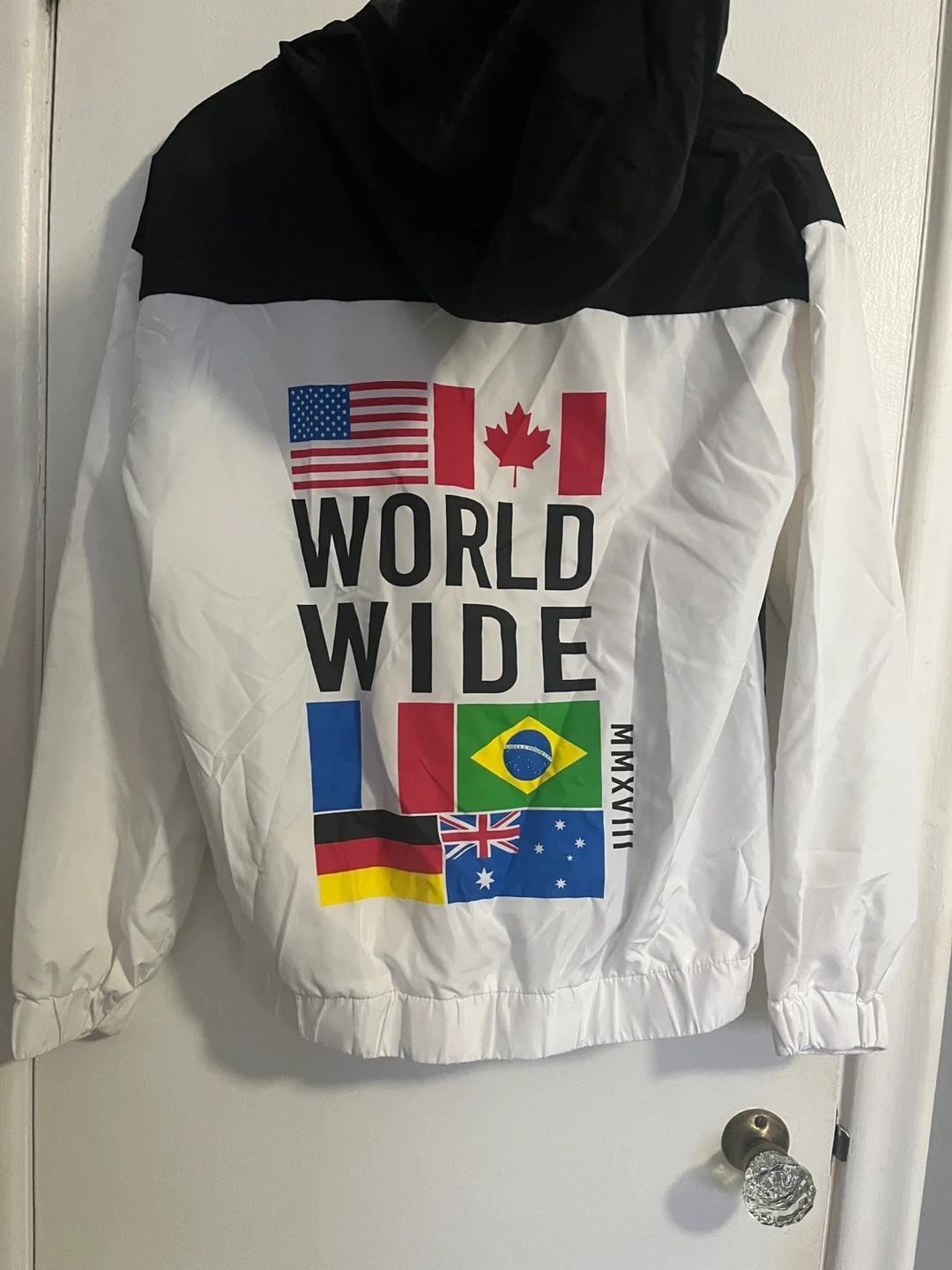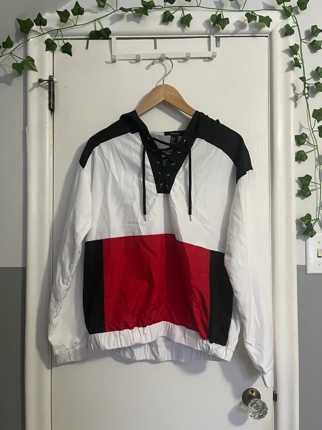 Selling a cute Forever 21 colour block windbreaker. It's a size small and features a black, white, and red design with flags on the back!
