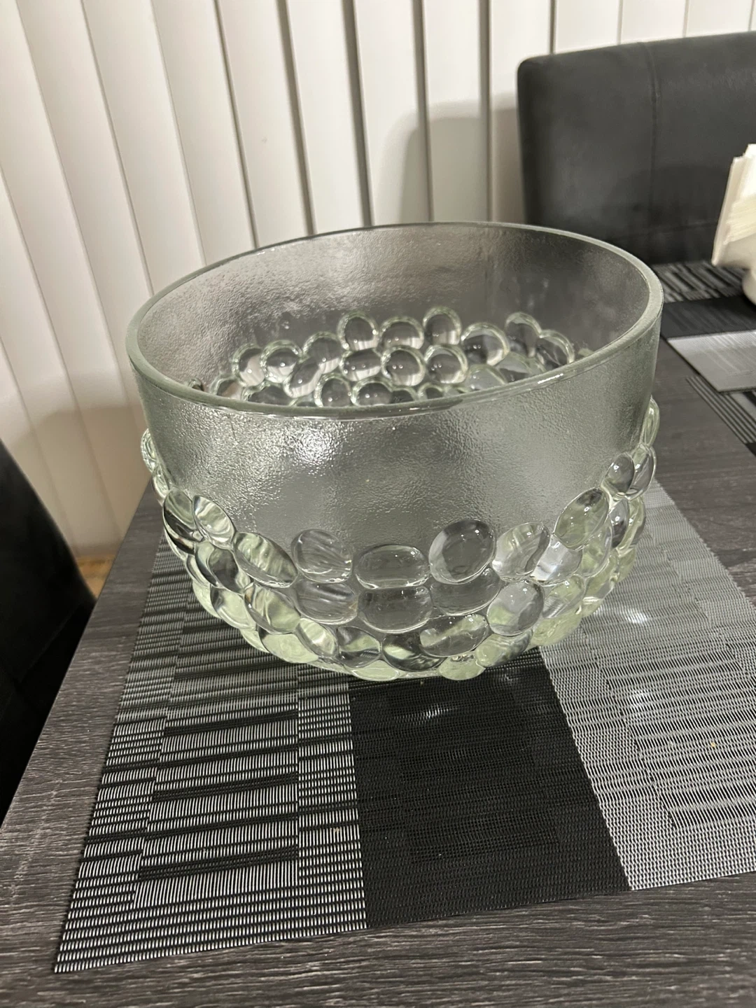 Clear glass bowl featuring a textured frosted rim and a decorative band of bubble accents around the exterior. This piece is made of durable glass. Great for trifle or fruit salads.