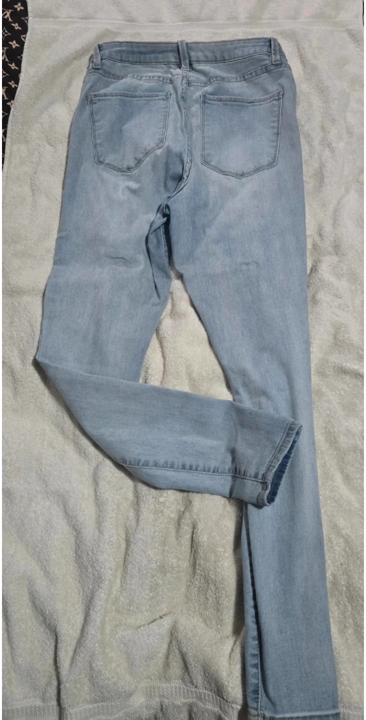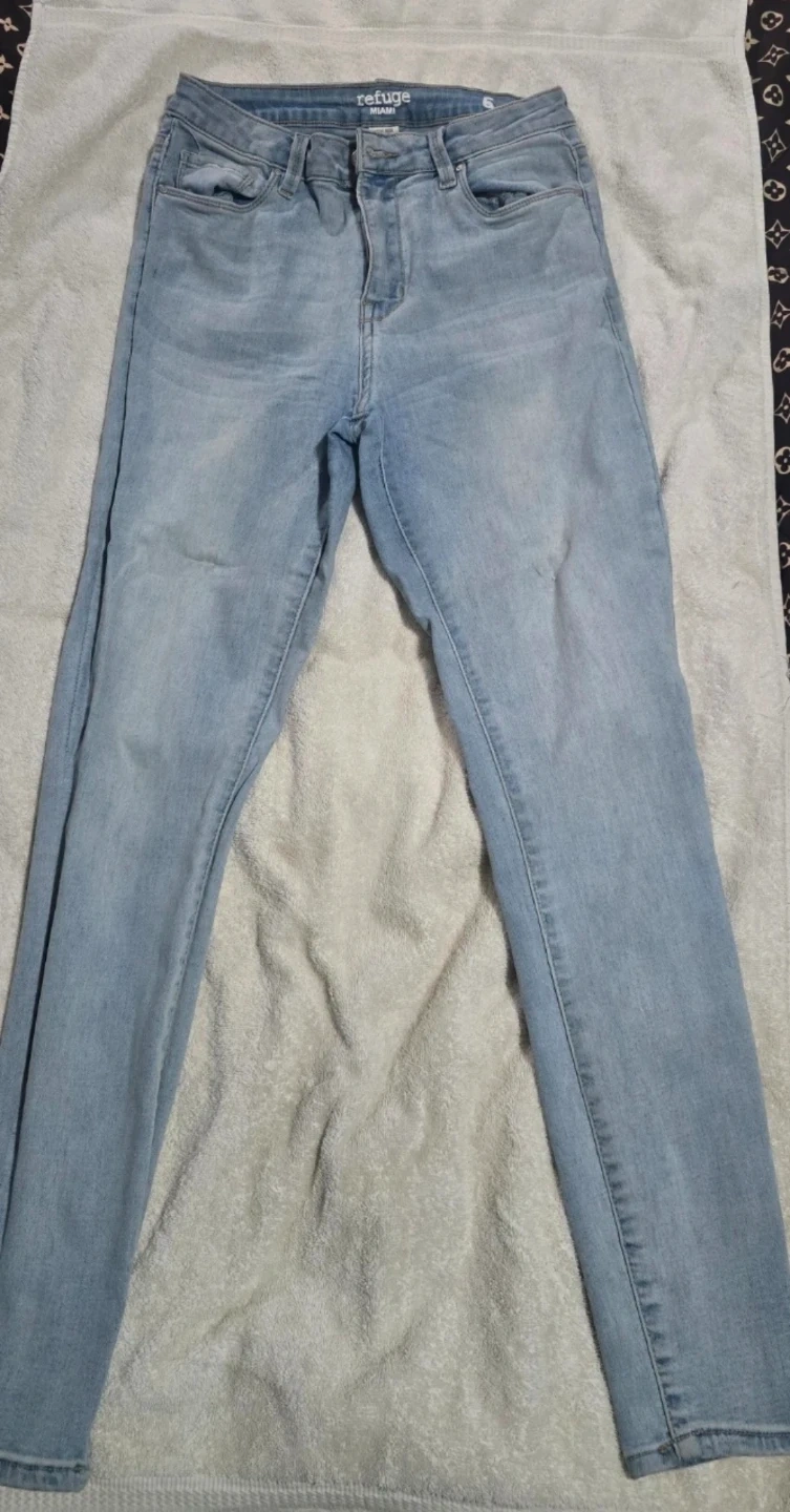 These are Refuge Miami high rise super skinny jeans. They're a light wash denim with a button and zip fly closure. Size is 5.