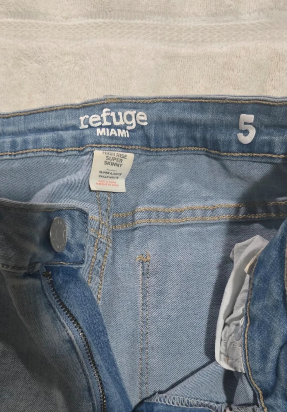 These are Refuge Miami high rise super skinny jeans. They're a light wash denim with a button and zip fly closure. Size is 5.