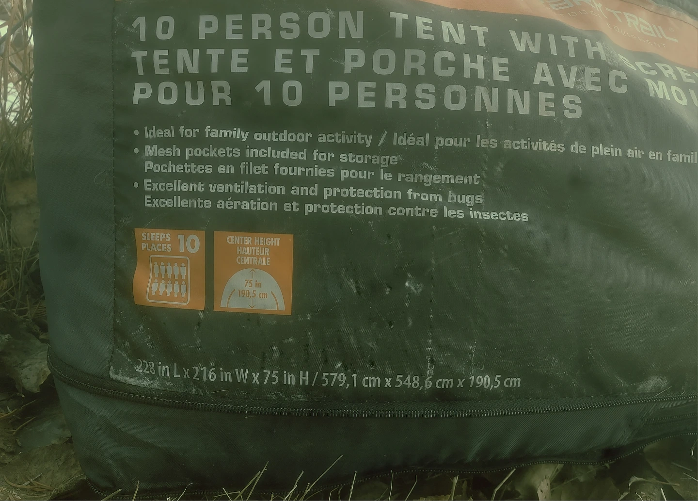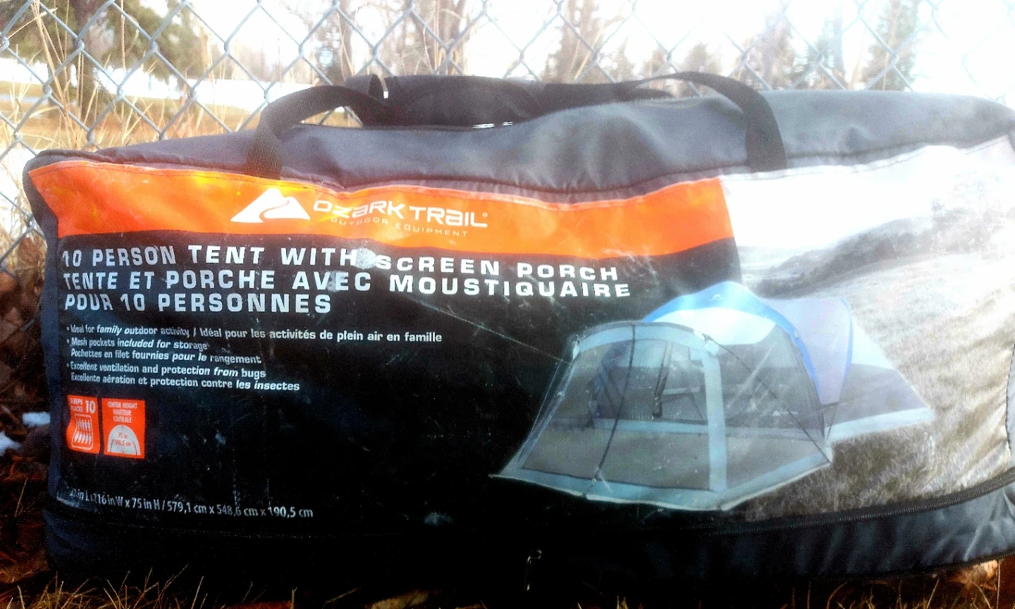 Ozark Trail 10 person tent with a screen porch. Sleeps 10 people and has a center height of 75 inches. It's 228 inches long by 216 inches wide. Mesh pockets are included for storage. Includes a screen porch!