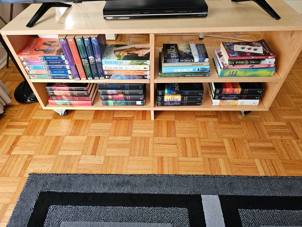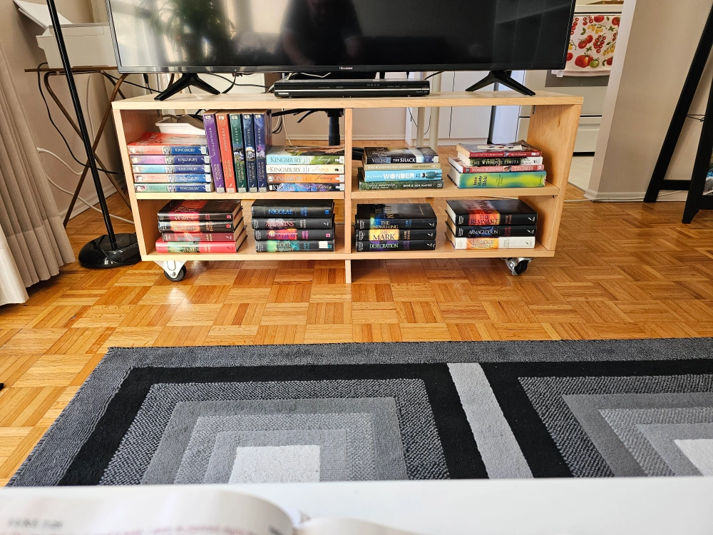 TV stand on wheels with shelves. Wheels one one side rotate for east moving and also lock. There's also a board that folds down to add extra stability. (Folds up for moving) Asking $57. Can be picked up in Winnipeg on Portage Ave in St. James. If I have to deliver it, it's $10 charge. P/f, s/f, b/f home.
