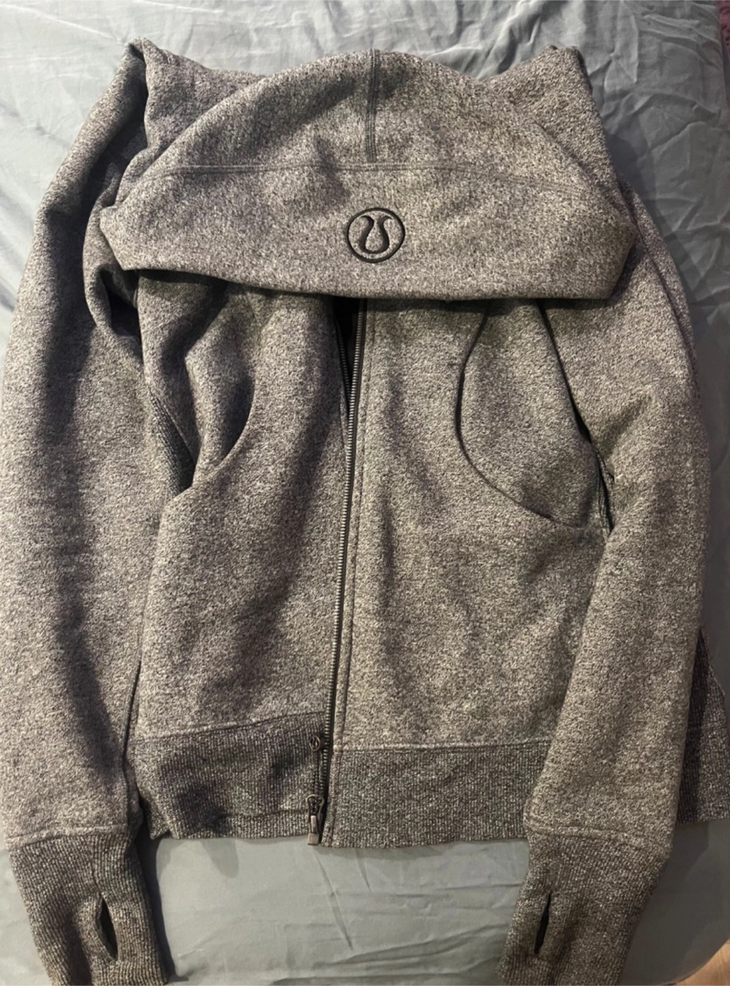Grey marl zip-up hoodie. Features a large hood and thumbholes. Soft and comfortable fabric.