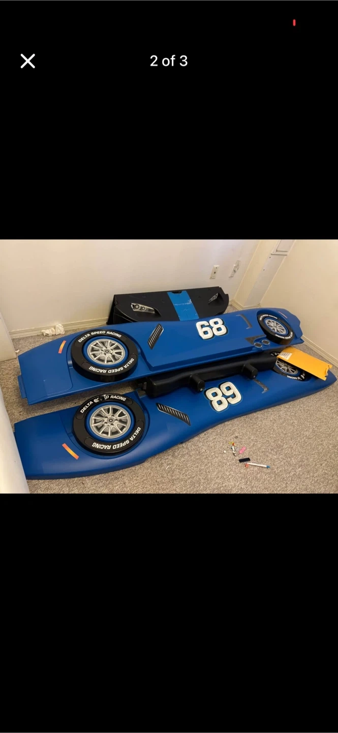 This blue race car toddler bed is designed for fun and comfort. It features a sleek, sporty look with "Delta Speed Racing" on the wheels and the number 68 on the side. This bed is made for young children transitioning to a larger bed.