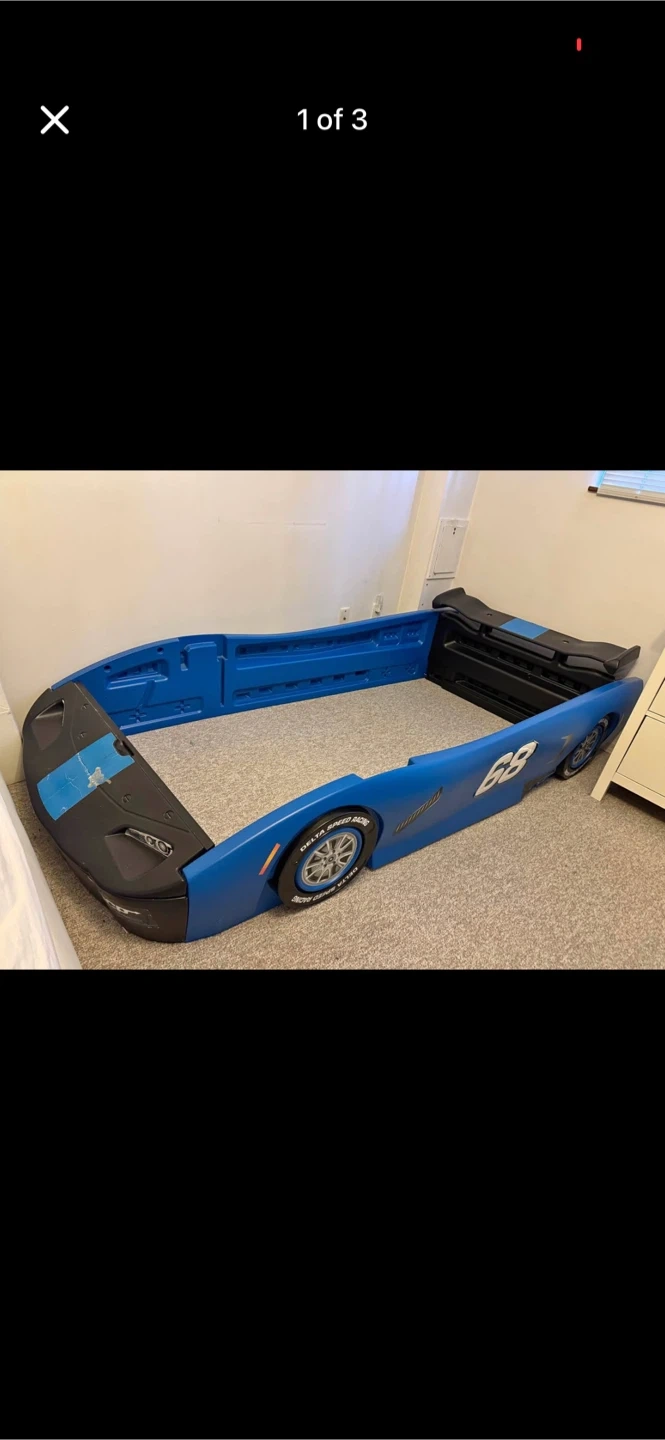 This blue race car toddler bed is designed for fun and comfort. It features a sleek, sporty look with "Delta Speed Racing" on the wheels and the number 68 on the side. This bed is made for young children transitioning to a larger bed.